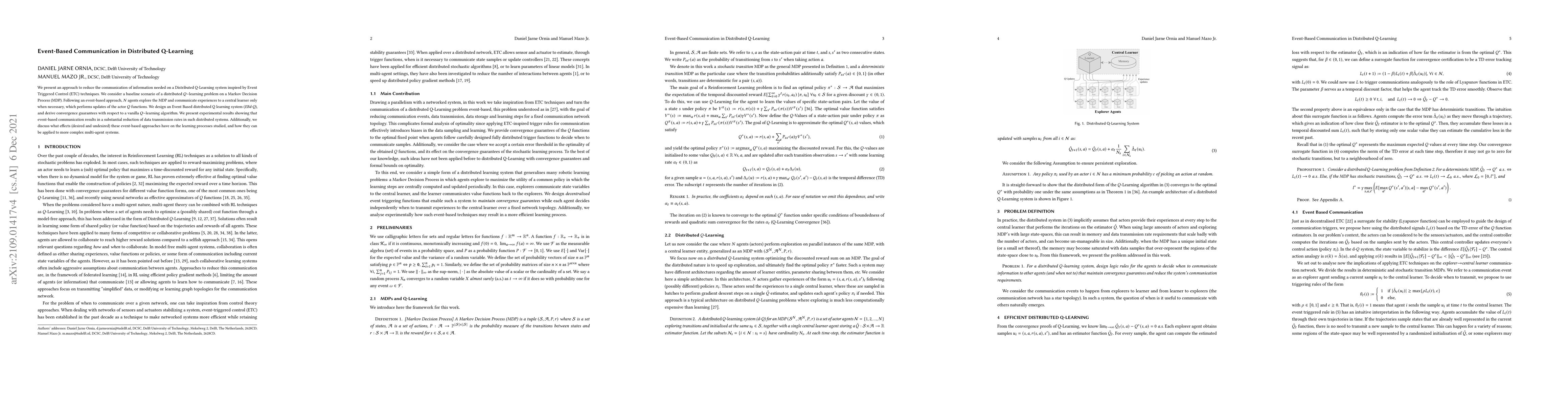 This paper proposes an event-based communication method for distributed Q-learning to minimize data transmission, inspired by event-triggered control techniques. The EBd-Q system allows agents to communicate experiences only when necessary, leading to significant reductions in communication rates compared to traditional methods.