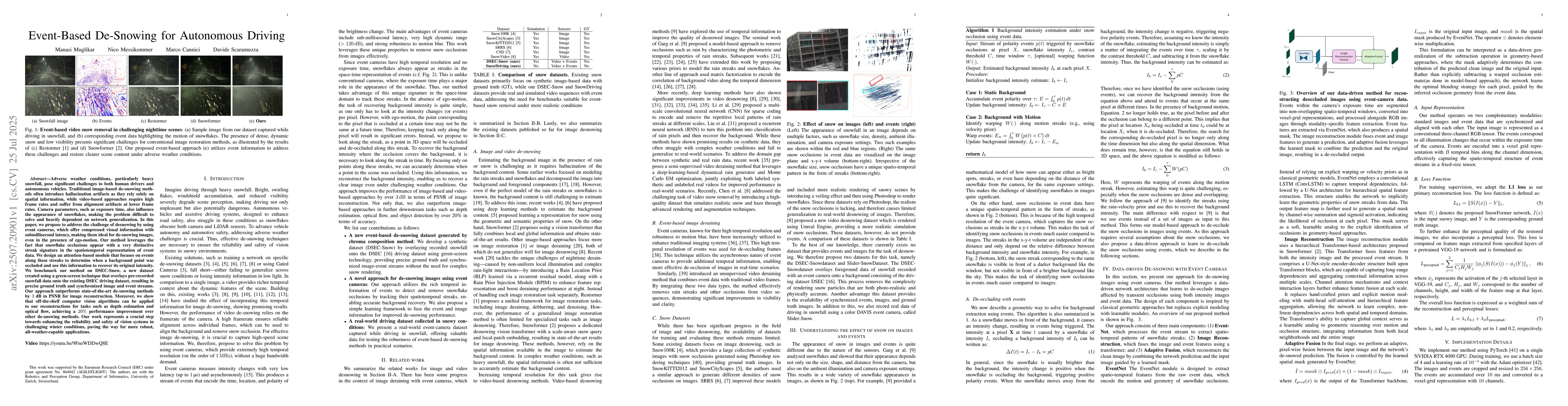This research introduces an event-based de-snowing method for autonomous driving using event cameras, which offer low-latency, compressed visual data. The proposed attention-based module identifies snowflake occlusions through distinctive streaks in spatio-temporal event data, outperforming traditional methods by 3 dB in PSNR for image reconstruction. The method also enhances downstream computer vision tasks like depth estimation and optical flow by 20%, contributing to safer, all-weather autonomous driving.