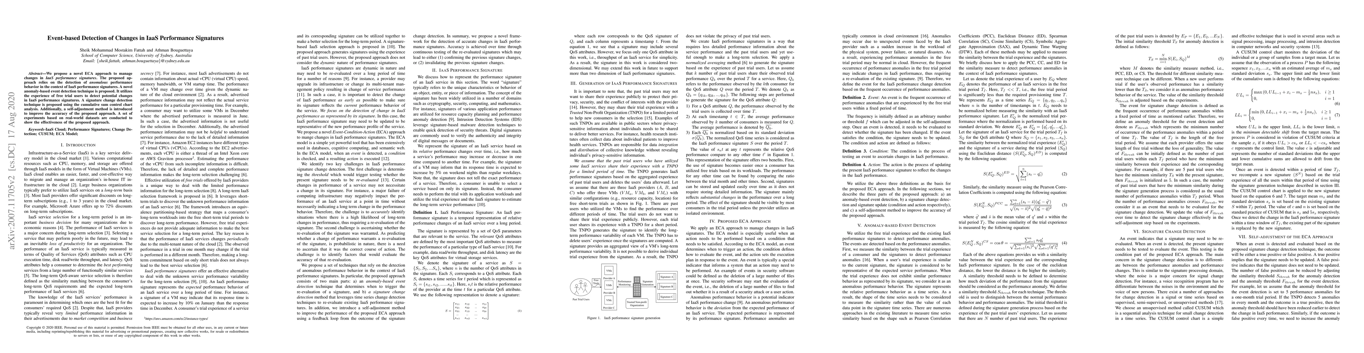 We propose a novel ECA approach to manage changes in IaaS performance signatures. The proposed approach relies on the detection of anomalous performance behavior in the context of IaaS performance signatures. A novel anomaly-based event detection technique is proposed. It utilizes the experience of free trial users to detect potential changes in IaaS performance signatures. A signature change detection technique is proposed using the cumulative sum control chart analysis. Additionally, a self-adjustment method is introduced to improve the accuracy of the proposed approach. A set of experiments based on real-world datasets are conducted to show the effectiveness of the proposed approach.