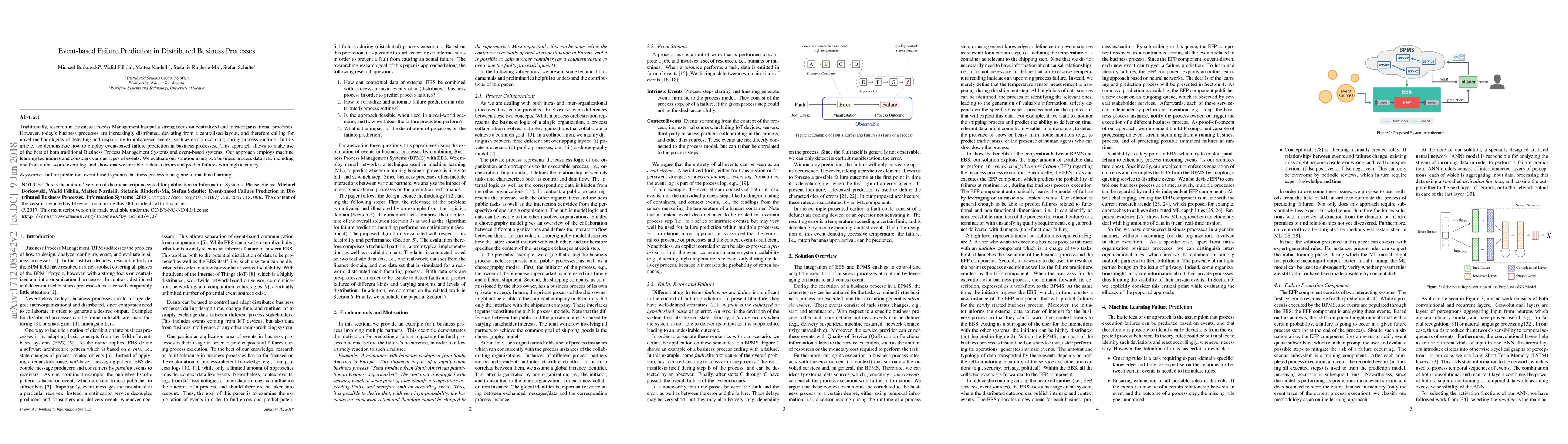 This paper proposes an event-based failure prediction methodology for distributed business processes, combining traditional Business Process Management Systems with event-based systems. The approach utilizes machine learning techniques to detect errors and predict failures, demonstrated through evaluations on two datasets, including a real-world event log, showing high accuracy in failure detection.