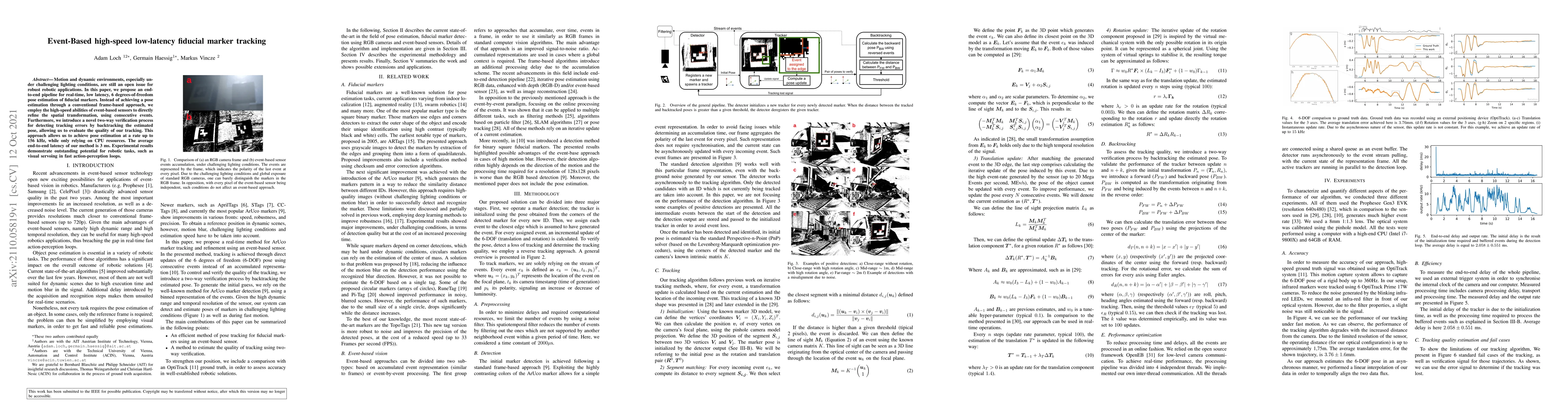 Motion and dynamic environments, especially under challenging lighting conditions, are still an open issue for robust robotic applications. In this paper, we propose an end-to-end pipeline for real-time, low latency, 6 degrees-of-freedom pose estimation of fiducial markers. Instead of achieving a pose estimation through a conventional frame-based approach, we employ the high-speed abilities of event-based sensors to directly refine the spatial transformation, using consecutive events. Furthermore, we introduce a novel two-way verification process for detecting tracking errors by backtracking the estimated pose, allowing us to evaluate the quality of our tracking. This approach allows us to achieve pose estimation at a rate up to 156~kHz, while only relying on CPU resources. The average end-to-end latency of our method is 3~ms. Experimental results demonstrate outstanding potential for robotic tasks, such as visual servoing in fast action-perception loops.