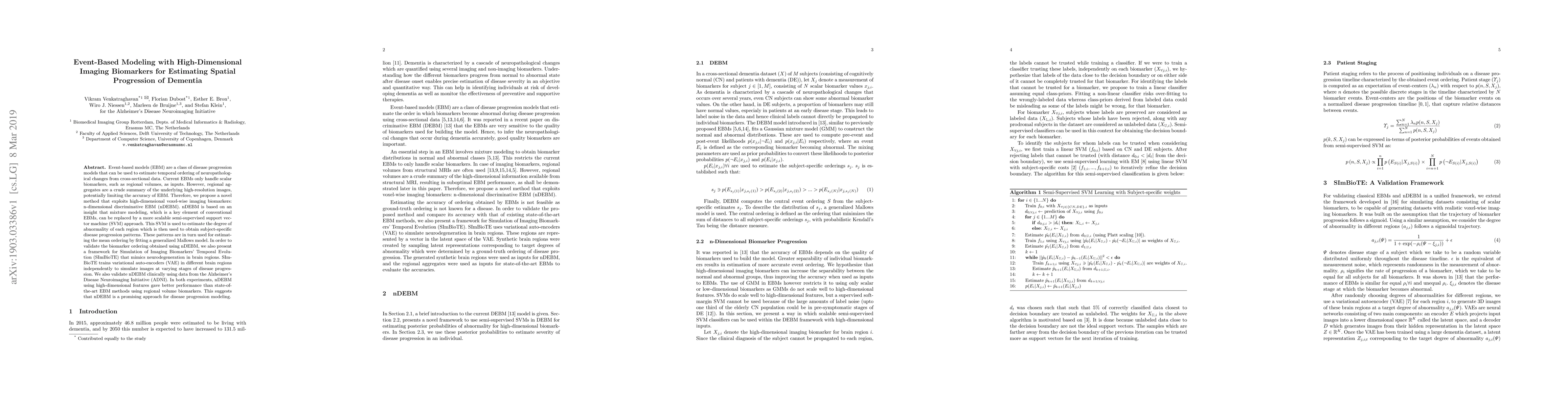 Event-based models (EBM) are a class of disease progression models that can be used to estimate temporal ordering of neuropathological changes from cross-sectional data. Current EBMs only handle scalar biomarkers, such as regional volumes, as inputs. However, regional aggregates are a crude summary of the underlying high-resolution images, potentially limiting the accuracy of EBM. Therefore, we propose a novel method that exploits high-dimensional voxel-wise imaging biomarkers: n-dimensional discriminative EBM (nDEBM). nDEBM is based on an insight that mixture modeling, which is a key element of conventional EBMs, can be replaced by a more scalable semi-supervised support vector machine (SVM) approach. This SVM is used to estimate the degree of abnormality of each region which is then used to obtain subject-specific disease progression patterns. These patterns are in turn used for estimating the mean ordering by fitting a generalized Mallows model. In order to validate the biomarker ordering obtained using nDEBM, we also present a framework for Simulation of Imaging Biomarkers' Temporal Evolution (SImBioTE) that mimics neurodegeneration in brain regions. SImBioTE trains variational auto-encoders (VAE) in different brain regions independently to simulate images at varying stages of disease progression. We also validate nDEBM clinically using data from the Alzheimer's Disease Neuroimaging Initiative (ADNI). In both experiments, nDEBM using high-dimensional features gave better performance than state-of-the-art EBM methods using regional volume biomarkers. This suggests that nDEBM is a promising approach for disease progression modeling.
