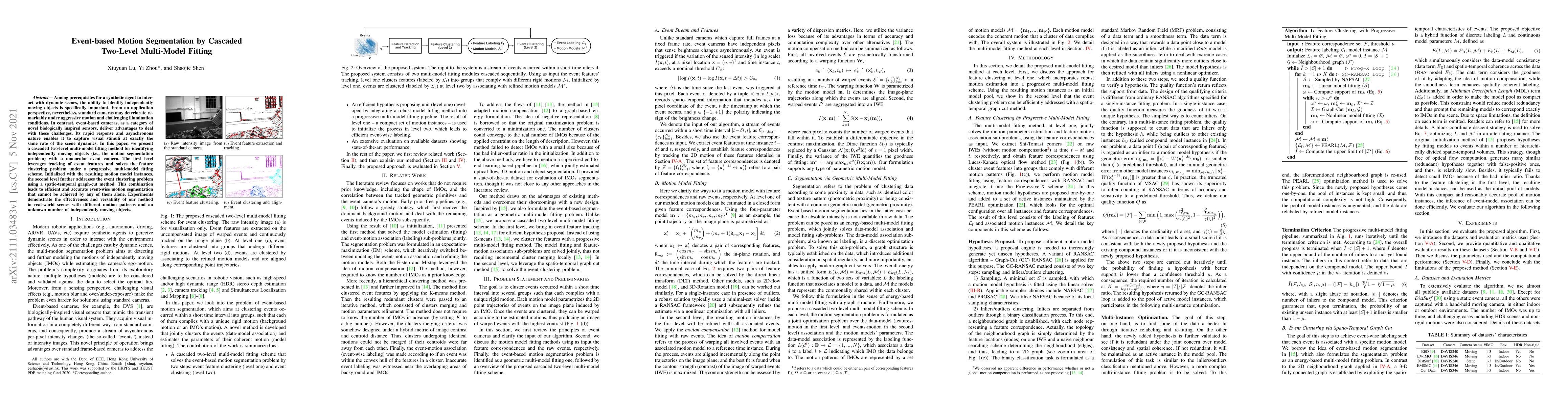 This paper proposes a cascaded two-level multi-model fitting method for motion segmentation using event-based cameras, which efficiently identifies independently moving objects in dynamic scenes. The method combines feature clustering and spatio-temporal graph-cut techniques to achieve accurate segmentation under challenging conditions.