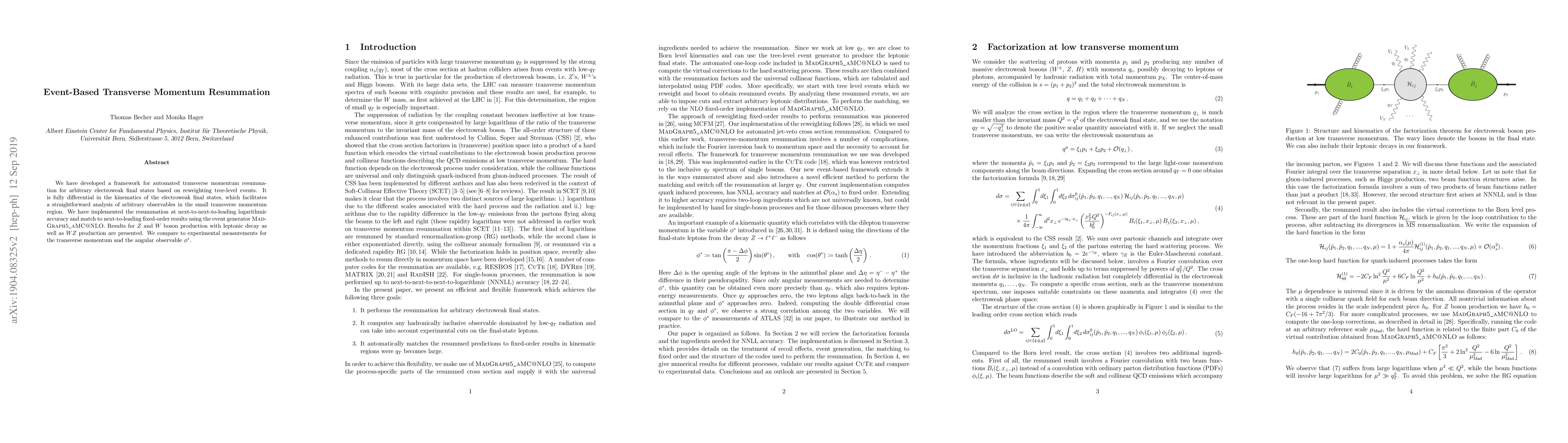 We have developed a framework for automated transverse momentum resummation for arbitrary electroweak final states based on reweighting tree-level events. It is fully differential in the kinematics of the electroweak final states, which facilitates a straightforward analysis of arbitrary observables in the small transverse momentum region. We have implemented the resummation at next-to-next-to-leading logarithmic accuracy and match to next-to-leading fixed-order results using the event generator MadGraph5_aMC@NLO. Results for $Z$ and $W$ boson production with leptonic decay as well as $WZ$ production are presented. We compare to experimental measurements for the transverse momentum and the angular observable $\phi^*$.