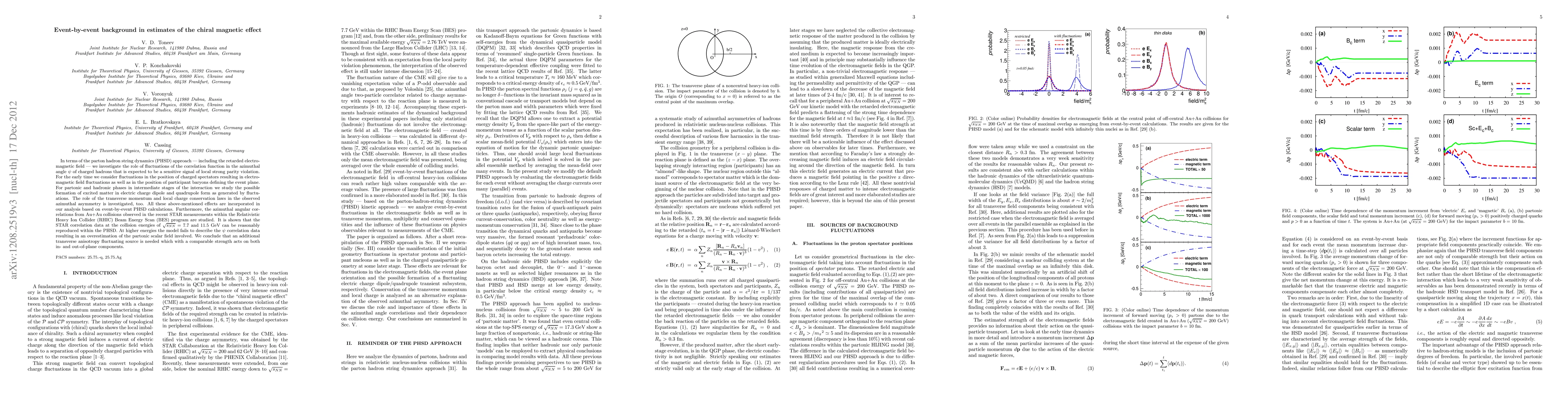 In terms of the parton-hadron-string-dynamics (PHSD) approach - including the retarded electromagnetic field - we investigate the role of fluctuations of the correlation function in the azimuthal angle $\psi$ of charged hadrons that is expected to be a sensitive signal of local strong parity violation. For the early time we consider fluctuations in the position of charged spectators resulting in electromagnetic field fluctuations as well as in the position of participant baryons defining the event plane. For partonic and hadronic phases in intermediate stages of the interaction we study the possible formation of excited matter in electric charge dipole and quadrupole form as generated by fluctuations. The role of the transverse momentum and local charge conservation laws in the observed azimuthal asymmetry is investigated, too. All these above-mentioned effects are incorporated in our analysis based on event-by-event PHSD calculations. Furthermore, the azimuthal angular correlations from Au+Au collisions observed in the recent STAR measurements within the RHIC Beam-Energy-Scan (BES) program are studied. It is shown that the STAR correlation data at the collision energies of $\sqrt{s_{NN}}$ = 7.7 and 11.5 GeV can be reasonably reproduced within the PHSD. At higher energies the model fails to describe the $\psi$ correlation data resulting in an overestimation of the partonic scalar field involved. We conclude that an additional transverse anisotropy fluctuating source is needed which with a comparable strength acts on both in- and out-of-plane components.
