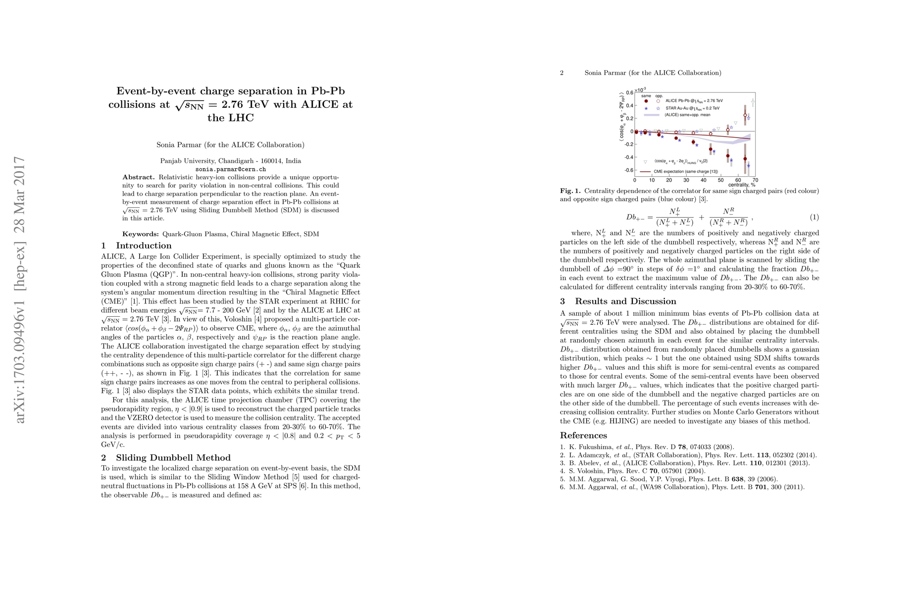 Relativistic heavy-ion collisions provide a unique opportunity to search for parity violation in non-central collisions. This could lead to charge separation perpendicular to the reaction plane. An event-by-event measurement of charge separation effect in Pb-Pb collisions at $\sqrt{s_{\rm NN}}$ = 2.76 TeV using Sliding Dumbbell Method (SDM) is discussed in this article.