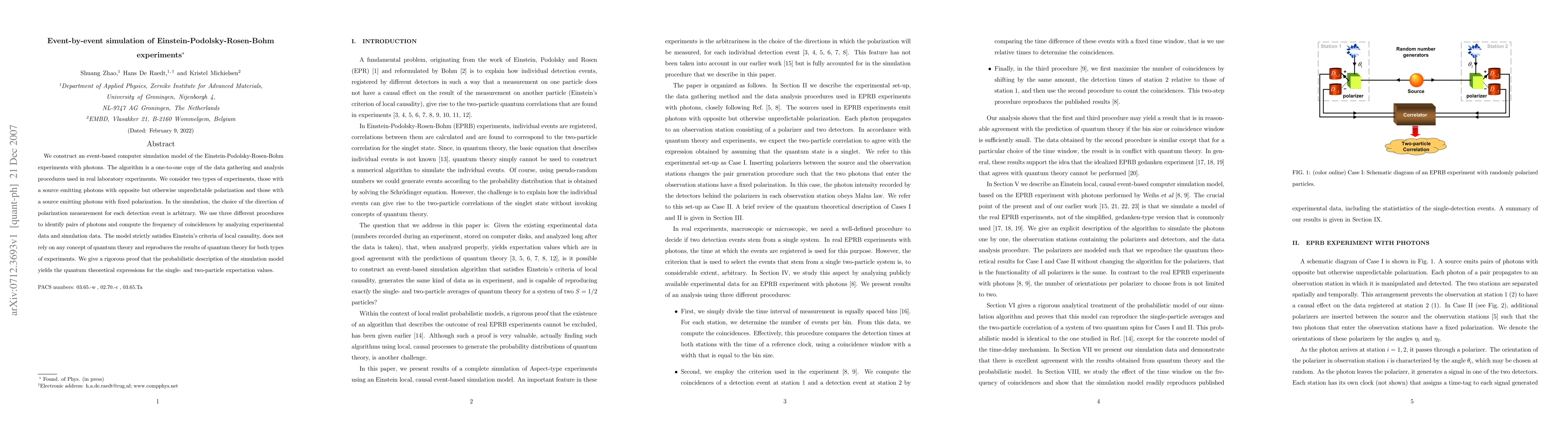 We construct an event-based computer simulation model of the Einstein-Podolsky-Rosen-Bohm experiments with photons. The algorithm is a one-to-one copy of the data gathering and analysis procedures used in real laboratory experiments. We consider two types of experiments, those with a source emitting photons with opposite but otherwise unpredictable polarization and those with a source emitting photons with fixed polarization. In the simulation, the choice of the direction of polarization measurement for each detection event is arbitrary. We use three different procedures to identify pairs of photons and compute the frequency of coincidences by analyzing experimental data and simulation data. The model strictly satisfies Einstein's criteria of local causality, does not rely on any concept of quantum theory and reproduces the results of quantum theory for both types of experiments. We give a rigorous proof that the probabilistic description of the simulation model yields the quantum theoretical expressions for the single- and two-particle expectation values.