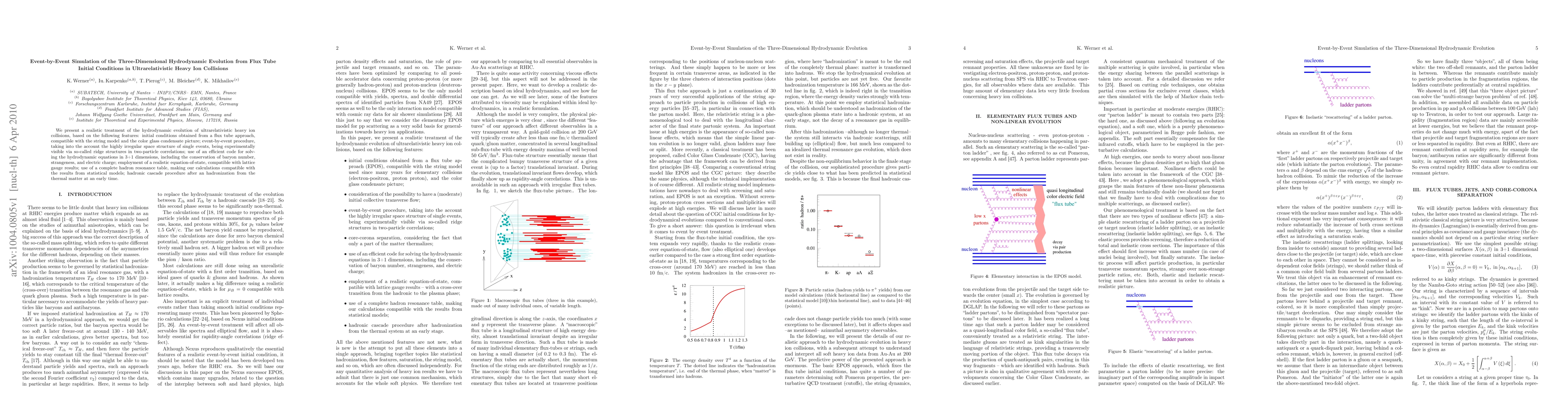 We present a realistic treatment of the hydrodynamic evolution of ultrarelativistic heavy ion collisions, based on the following features: initial conditions obtained from a flux tube approach, compatible with the string model and the color glass condensate picture; event-by-event procedure, taking into the account the highly irregular space structure of single events, being experimentally visible via so-called ridge structures in two-particle correlations; use of an efficient code for solving the hydrodynamic equations in 3+1 dimensions, including the conservation of baryon number, strangeness, and electric charge; employment of a realistic equation-of-state, compatible with lattice gauge results; use of a complete hadron resonance table, making our calculations compatible with the results from statistical models; hadronic cascade procedure after an hadronization from the thermal matter at an early time.