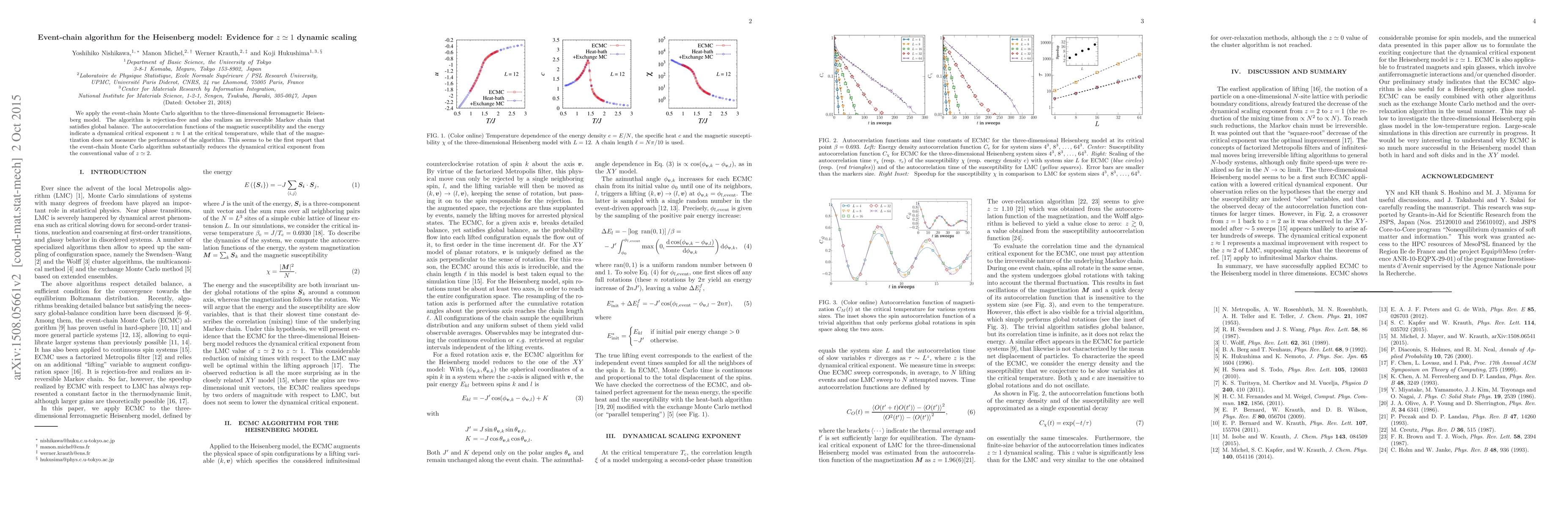 This study employs the event-chain Monte Carlo algorithm to investigate the three-dimensional ferromagnetic Heisenberg model, revealing a dynamical critical exponent $z \approx 1$ near the critical temperature, suggesting a significant reduction from the conventional value of $z \simeq 2$. The algorithm's effectiveness is demonstrated through the autocorrelation functions of magnetic susceptibility and energy.