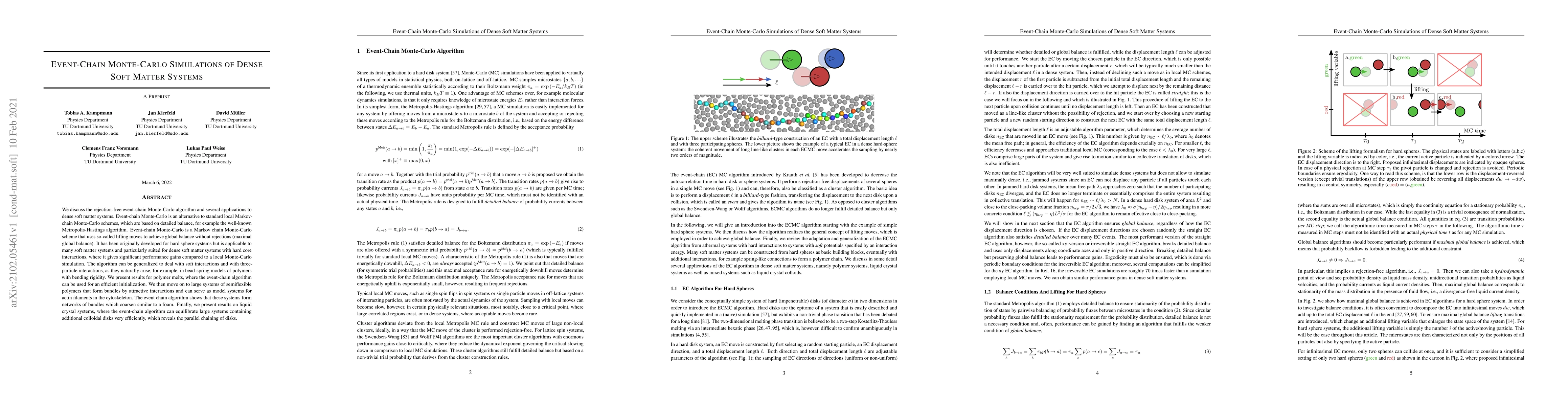 This paper presents the event-chain Monte-Carlo algorithm, a rejection-free method for simulating dense soft matter systems, offering significant performance gains over local Markov-chain methods. The algorithm is applied to polymer melts, semiflexible polymer bundles, and liquid crystal systems, demonstrating its efficiency and effectiveness in simulating complex interactions.
