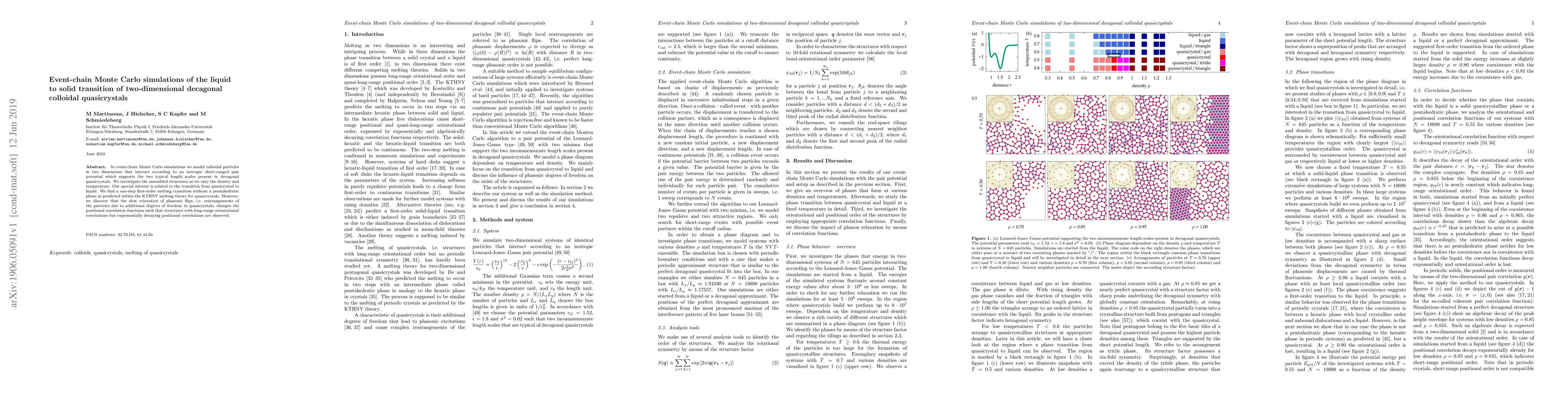This study uses event-chain Monte Carlo simulations to model the liquid-to-solid transition in two-dimensional decagonal colloidal quasicrystals, revealing a one-step first-order melting transition without a pentahedratic phase. The research highlights that phasonic flips lead to structures with long-range orientational but exponentially decaying positional correlations.