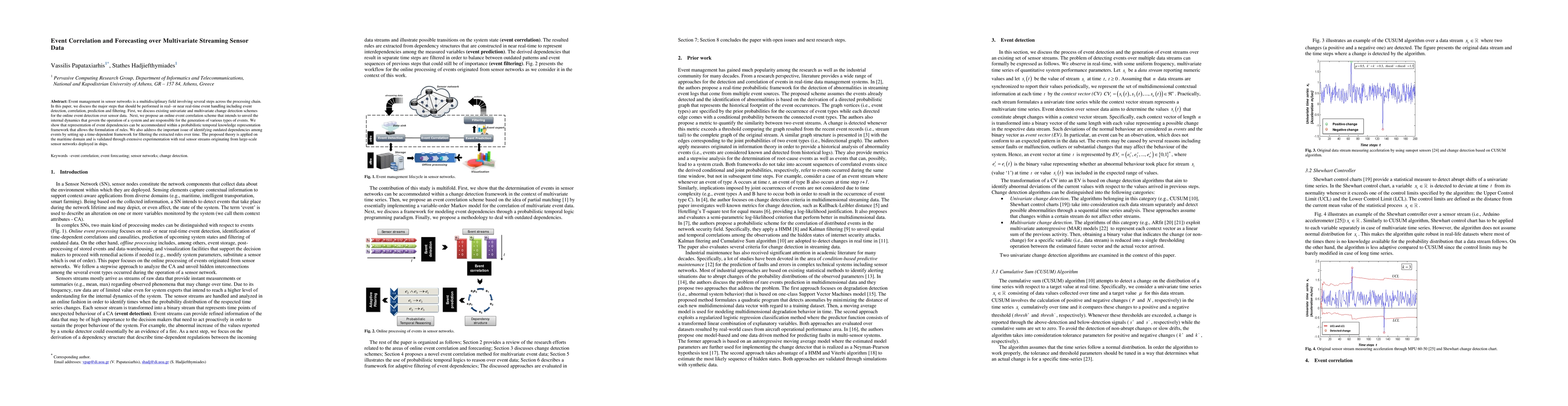 Event management in sensor networks is a multidisciplinary field involving several steps across the processing chain. In this paper, we discuss the major steps that should be performed in real- or near real-time event handling including event detection, correlation, prediction and filtering. First, we discuss existing univariate and multivariate change detection schemes for the online event detection over sensor data. Next, we propose an online event correlation scheme that intends to unveil the internal dynamics that govern the operation of a system and are responsible for the generation of various types of events. We show that representation of event dependencies can be accommodated within a probabilistic temporal knowledge representation framework that allows the formulation of rules. We also address the important issue of identifying outdated dependencies among events by setting up a time-dependent framework for filtering the extracted rules over time. The proposed theory is applied on the maritime domain and is validated through extensive experimentation with real sensor streams originating from large-scale sensor networks deployed in ships.