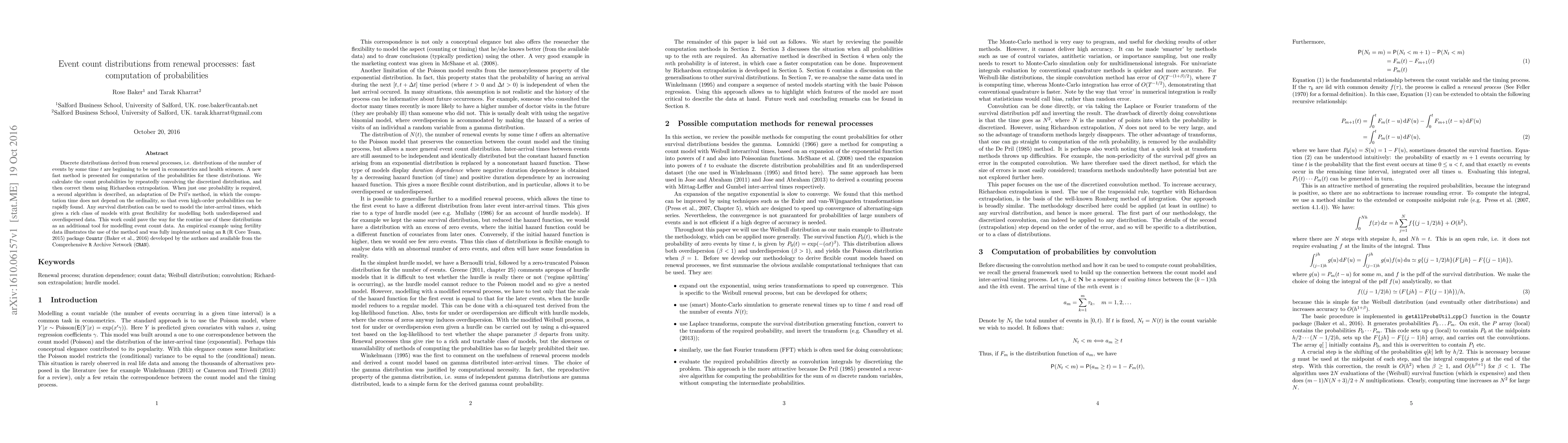 Discrete distributions derived from renewal processes, ie distributions of the number of events by some time t are beginning to be used in econometrics and health sciences. A new fast method is presented for computation of the probabilities for these distributions. We calculate the count probabilities by repeatedly convolving the discretized distribution, and then correct them using Richardson extrapolation. When just one probability is required, a second algorithm is described, an adaptation of De Pril's method, in which the computation time does not depend on the ordinality, so that even high-order probabilities can be rapidly found. Any survival distribution can be used to model the inter-arrival times, which gives a rich class of models with great flexibility for modelling both underdispersed and overdispersed data. This work could pave the way for the routine use of these distributions as an additional tool for modelling event count data. An empirical example using fertility data illustrates the use of the method and was fully implemented using an R package Countr developed by the authors and available from the Comprehensive R Archive Network.