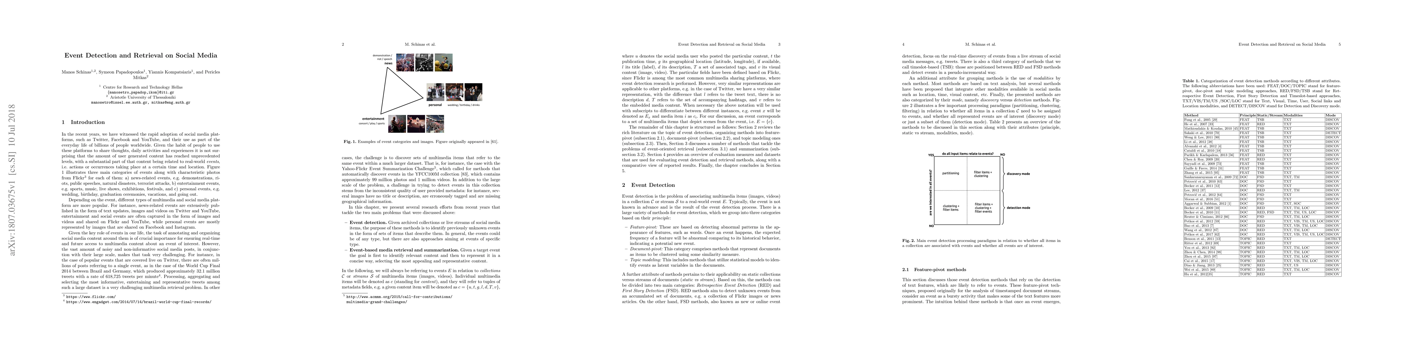 This paper discusses recent research on detecting and retrieving events from social media platforms like Twitter and Facebook, focusing on identifying unknown events from social media content and summarizing relevant media for specific events in a concise format.
