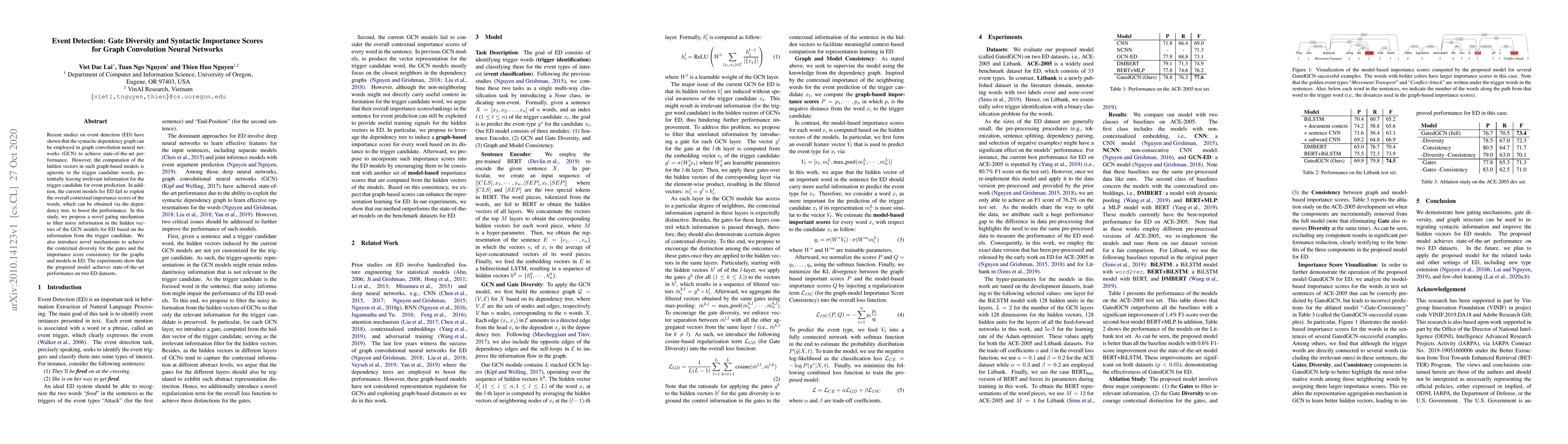 Recent studies on event detection (ED) haveshown that the syntactic dependency graph canbe employed in graph convolution neural net-works (GCN) to achieve state-of-the-art per-formance. However, the computation of thehidden vectors in such graph-based models isagnostic to the trigger candidate words, po-tentially leaving irrelevant information for thetrigger candidate for event prediction. In addi-tion, the current models for ED fail to exploitthe overall contextual importance scores of thewords, which can be obtained via the depen-dency tree, to boost the performance. In thisstudy, we propose a novel gating mechanismto filter noisy information in the hidden vec-tors of the GCN models for ED based on theinformation from the trigger candidate. Wealso introduce novel mechanisms to achievethe contextual diversity for the gates and theimportance score consistency for the graphsand models in ED. The experiments show thatthe proposed model achieves state-of-the-artperformance on two ED datasets
