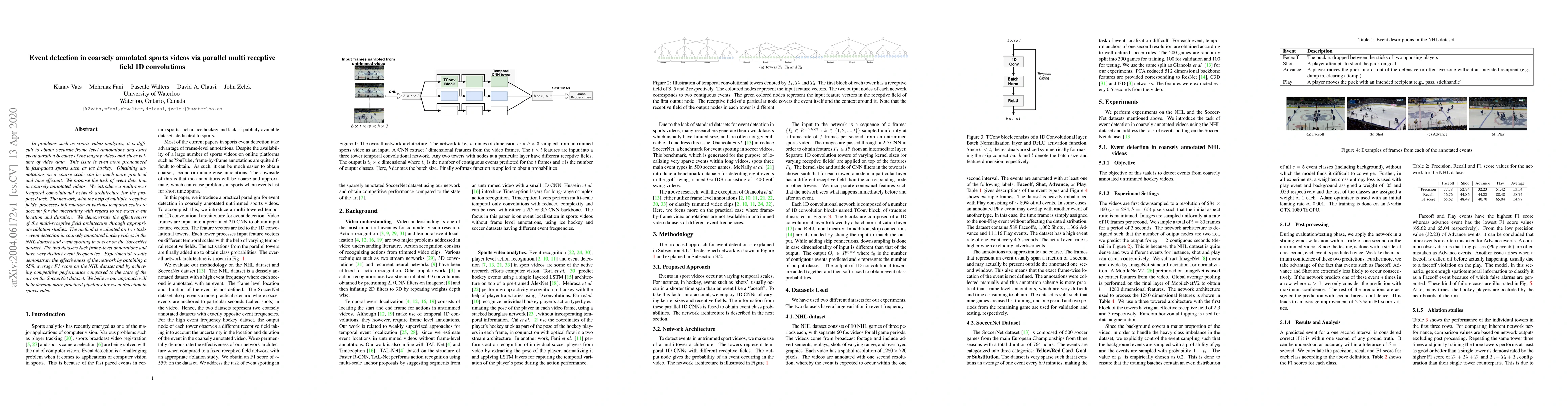 This paper proposes a multi-tower temporal convolutional network for event detection in coarsely annotated sports videos, utilizing parallel multi-receptive field 1D convolutions to handle temporal scale uncertainties. The method achieves a 55% average F1 score on NHL hockey videos and competitive performance on SoccerNet, demonstrating its effectiveness for practical sports video analytics.