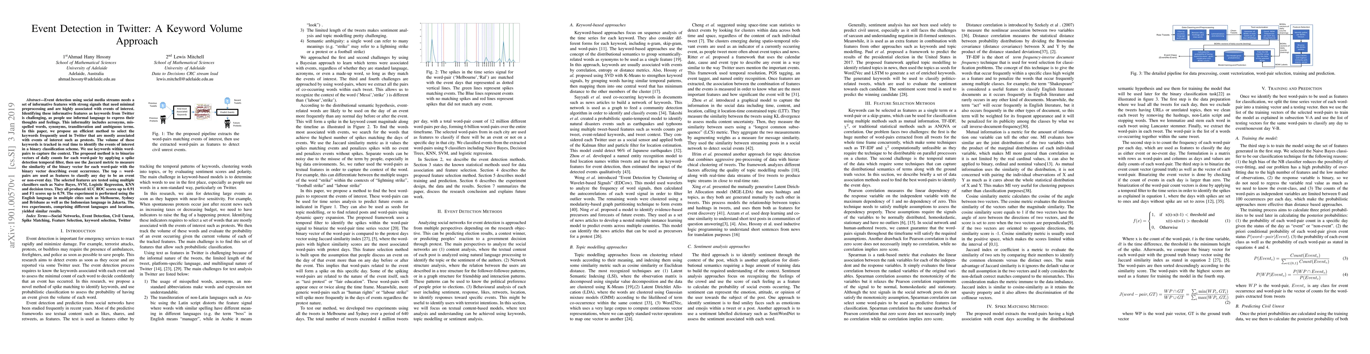 Event detection using social media streams needs a set of informative features with strong signals that need minimal preprocessing and are highly associated with events of interest. Identifying these informative features as keywords from Twitter is challenging, as people use informal language to express their thoughts and feelings. This informality includes acronyms, misspelled words, synonyms, transliteration and ambiguous terms. In this paper, we propose an efficient method to select the keywords frequently used in Twitter that are mostly associated with events of interest such as protests. The volume of these keywords is tracked in real time to identify the events of interest in a binary classification scheme. We use keywords within word-pairs to capture the context. The proposed method is to binarize vectors of daily counts for each word-pair by applying a spike detection temporal filter, then use the Jaccard metric to measure the similarity of the binary vector for each word-pair with the binary vector describing event occurrence. The top n word-pairs are used as features to classify any day to be an event or non-event day. The selected features are tested using multiple classifiers such as Naive Bayes, SVM, Logistic Regression, KNN and decision trees. They all produced AUC ROC scores up to 0.91 and F1 scores up to 0.79. The experiment is performed using the English language in multiple cities such as Melbourne, Sydney and Brisbane as well as the Indonesian language in Jakarta. The two experiments, comprising different languages and locations, yielded similar results.