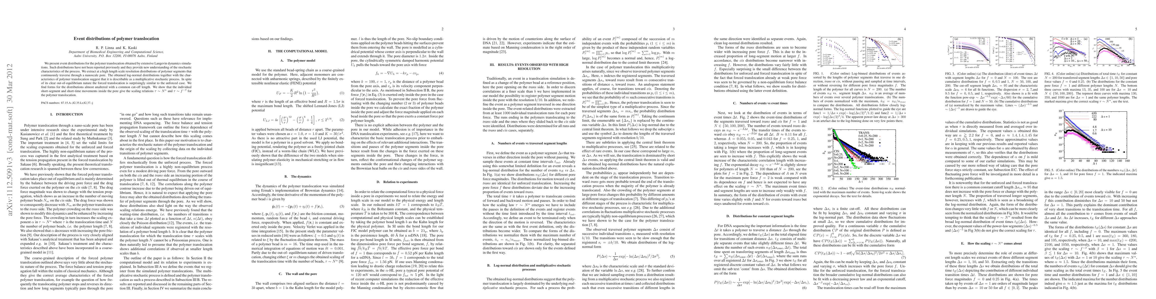 Extensive Langevin dynamics simulations were conducted to analyze polymer translocation events, registering segment motion inside the pore with high resolution (b/10). The study examined both unforced and forced translocations, focusing on event distributions, event times, and their scaling with polymer length and force.