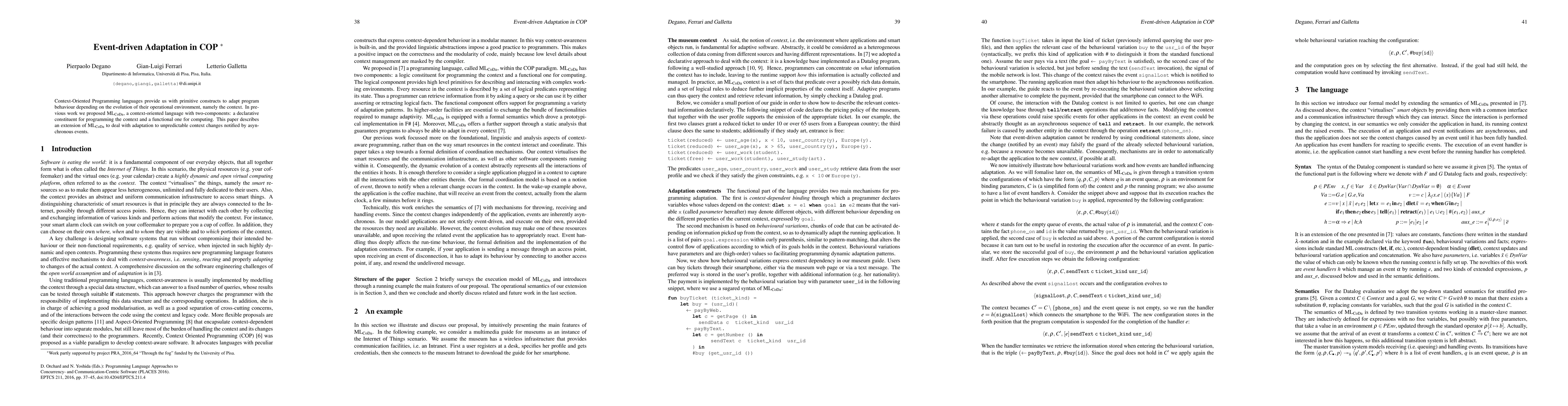 A context-oriented programming language is extended to handle adaptation to unpredictable changes in its environment through asynchronous events. This allows for more dynamic and responsive program behavior.