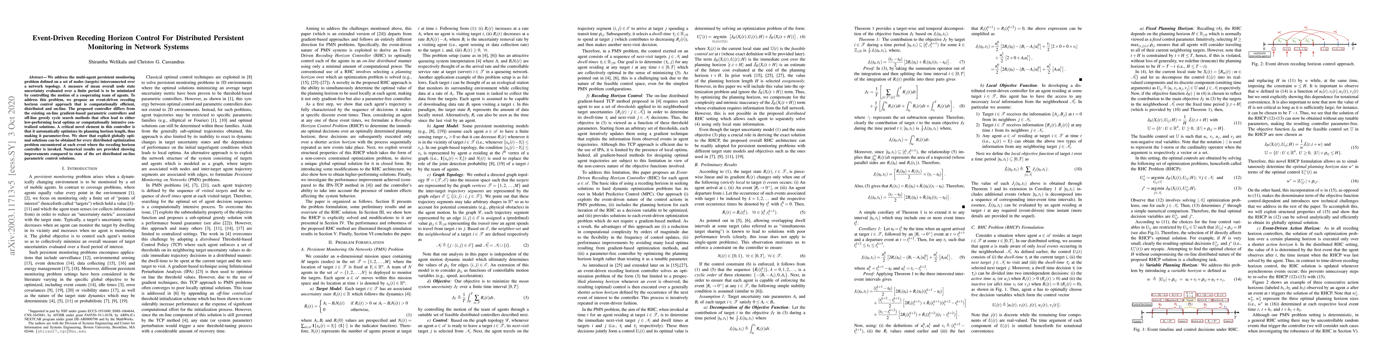 This paper proposes an event-driven receding horizon control method for multi-agent persistent monitoring in networked systems, aiming to minimize mean node state uncertainty. The approach is distributed, computationally efficient, and parameter-free, optimizing its planning horizon length automatically, and demonstrates superior performance compared to existing methods.