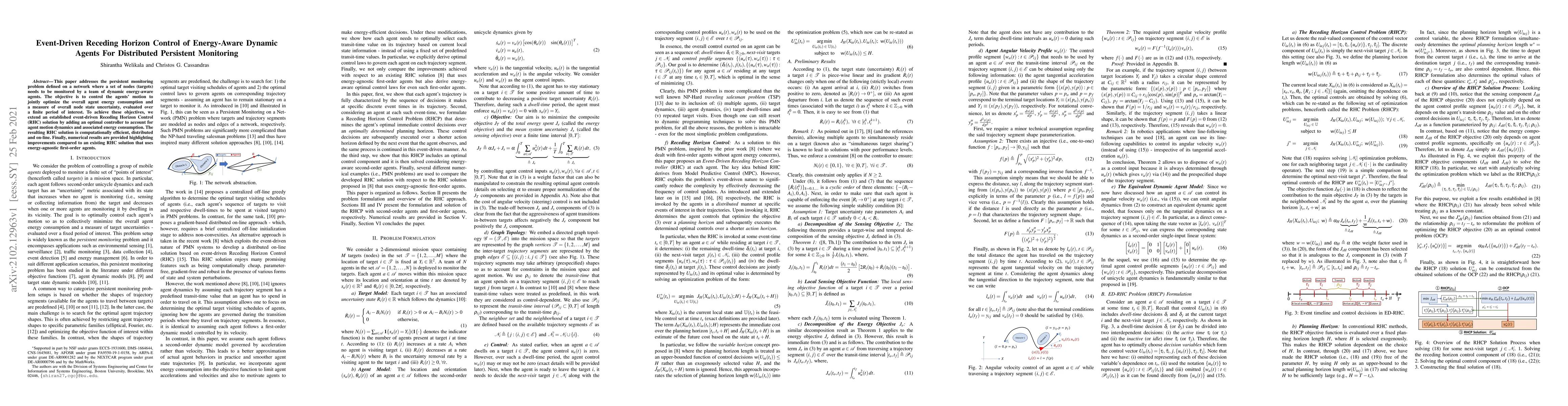This paper proposes an event-driven Receding Horizon Control (RHC) method for energy-aware dynamic agents to optimize energy consumption and node state uncertainty in distributed persistent monitoring. The enhanced RHC solution is computationally efficient, distributed, and online, demonstrating improvements over existing energy-agnostic methods.