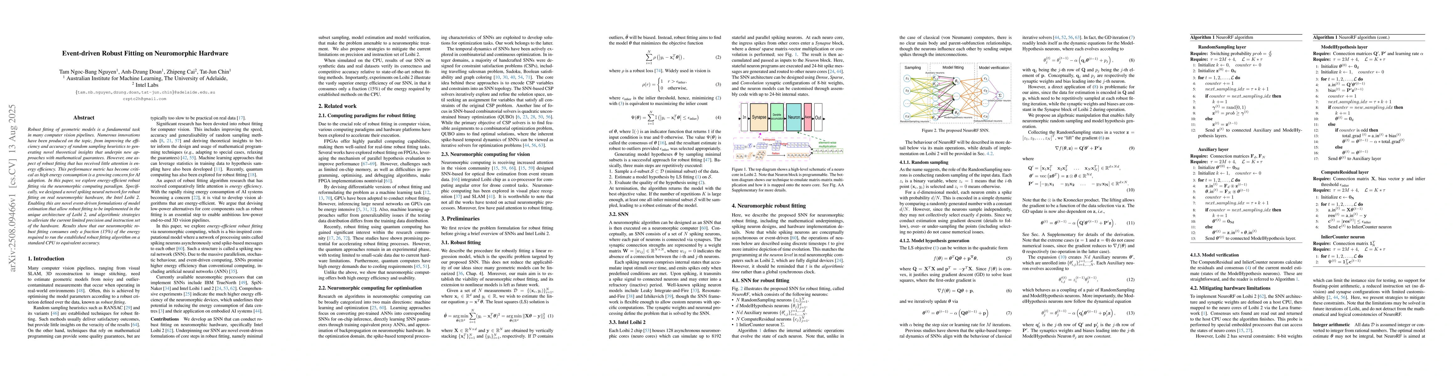Robust fitting of geometric models is a fundamental task in many computer vision pipelines. Numerous innovations have been produced on the topic, from improving the efficiency and accuracy of random sampling heuristics to generating novel theoretical insights that underpin new approaches with mathematical guarantees. However, one aspect of robust fitting that has received little attention is energy efficiency. This performance metric has become critical as high energy consumption is a growing concern for AI adoption. In this paper, we explore energy-efficient robust fitting via the neuromorphic computing paradigm. Specifically, we designed a novel spiking neural network for robust fitting on real neuromorphic hardware, the Intel Loihi 2. Enabling this are novel event-driven formulations of model estimation that allow robust fitting to be implemented in the unique architecture of Loihi 2, and algorithmic strategies to alleviate the current limited precision and instruction set of the hardware. Results show that our neuromorphic robust fitting consumes only a fraction (15%) of the energy required to run the established robust fitting algorithm on a standard CPU to equivalent accuracy.