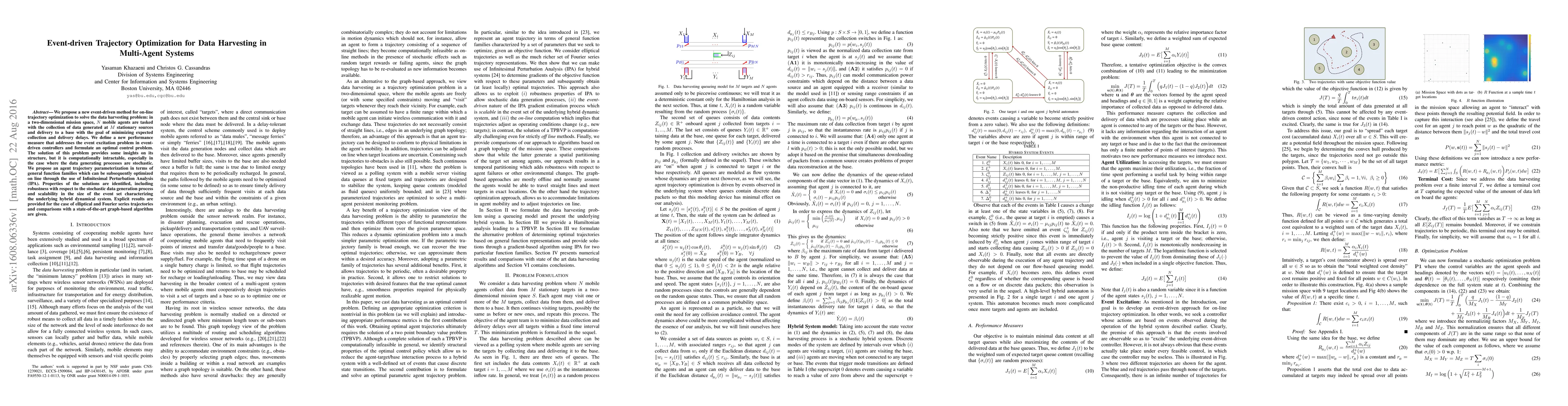 We propose a new event-driven method for on-line trajectory optimization to solve the data harvesting problem: in a two-dimensional mission space, N mobile agents are tasked with the collection of data generated at M stationary sources and delivery to a base with the goal of minimizing expected collection and delivery delays. We define a new performance measure that addresses the event excitation problem in event-driven controllers and formulate an optimal control problem. The solution of this problem provides some insights on its structure, but it is computationally intractable, especially in the case where the data generating processes are stochastic. We propose an agent trajectory parameterization in terms of general function families which can be subsequently optimized on line through the use of Infinitesimal Perturbation Analysis (IPA). Properties of the solutions are identified, including robustness with respect to the stochastic data generation process and scalability in the size of the event set characterizing the underlying hybrid dynamical system. Explicit results are provided for the case of elliptical and Fourier series trajectories and comparisons with a state-of-the-art graph-based algorithm are given.