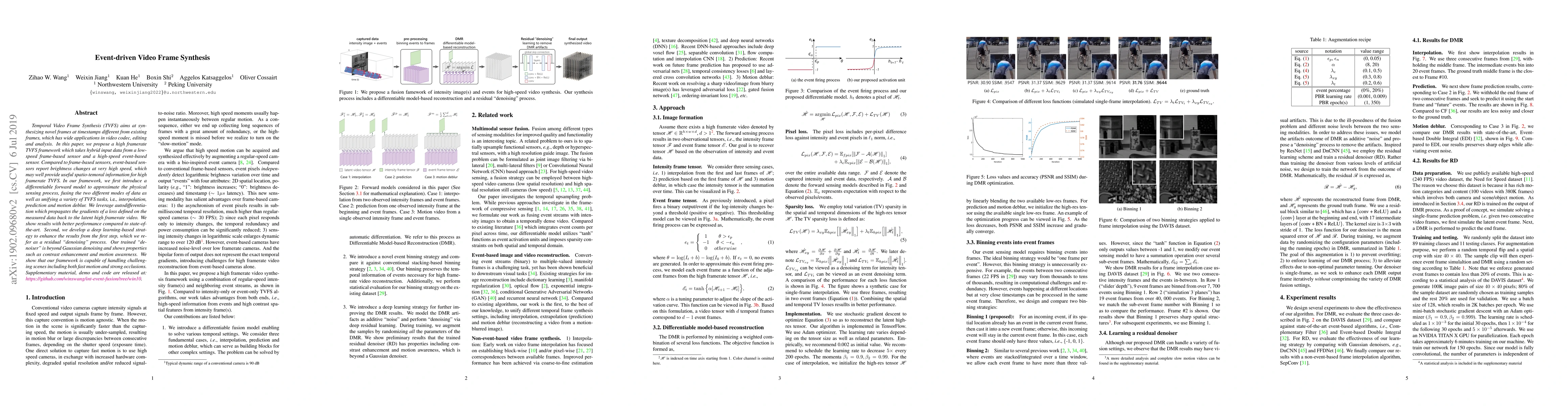 Temporal Video Frame Synthesis (TVFS) aims at synthesizing novel frames at timestamps different from existing frames, which has wide applications in video codec, editing and analysis. In this paper, we propose a high framerate TVFS framework which takes hybrid input data from a low-speed frame-based sensor and a high-speed event-based sensor. Compared to frame-based sensors, event-based sensors report brightness changes at very high speed, which may well provide useful spatio-temoral information for high framerate TVFS. In our framework, we first introduce a differentiable forward model to approximate the physical sensing process, fusing the two different modes of data as well as unifying a variety of TVFS tasks, i.e., interpolation, prediction and motion deblur. We leverage autodifferentiation which propagates the gradients of a loss defined on the measured data back to the latent high framerate video. We show results with better performance compared to state-of-the-art. Second, we develop a deep learning-based strategy to enhance the results from the first step, which we refer as a residual "denoising" process. Our trained "denoiser" is beyond Gaussian denoising and shows properties such as contrast enhancement and motion awareness. We show that our framework is capable of handling challenging scenes including both fast motion and strong occlusions.