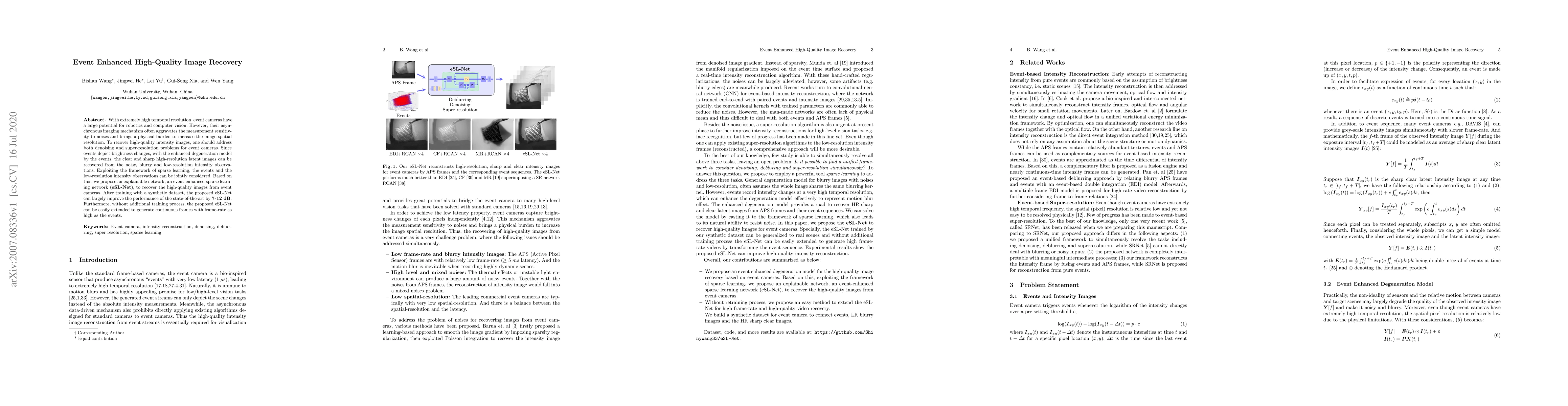 A new network architecture called eSL-Net is proposed to improve image recovery from event cameras, achieving 7-12 dB performance gains over state-of-the-art methods.