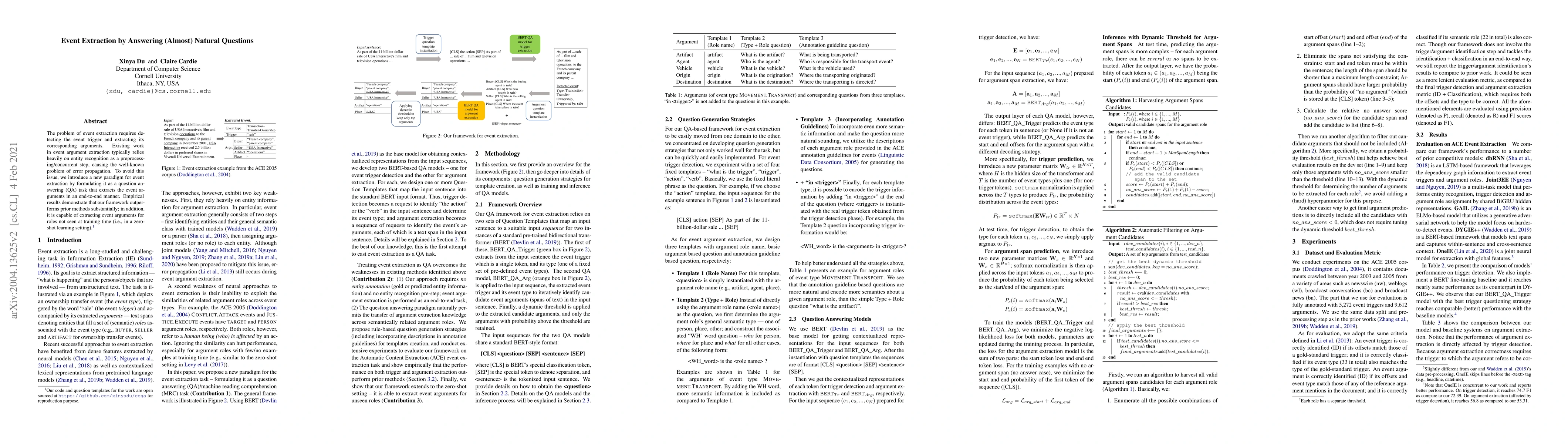 This paper proposes a novel event extraction method by framing it as a question answering task, which extracts event arguments directly and avoids error propagation from entity recognition. The approach demonstrates superior performance and zero-shot learning capabilities.