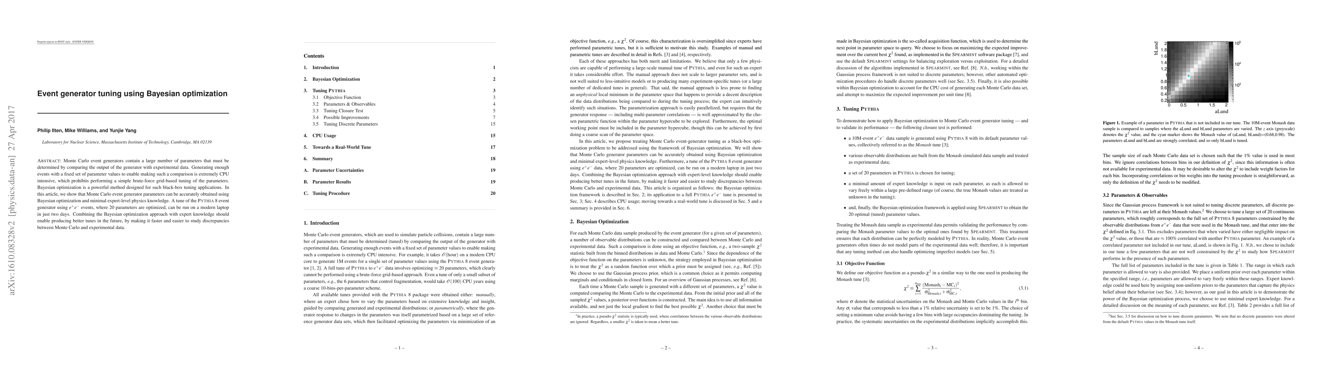 This paper demonstrates that Bayesian optimization can efficiently tune the parameters of Monte Carlo event generators, significantly reducing the computational cost compared to traditional methods. Using this approach, the authors successfully optimized 20 parameters of the PYTHIA 8 event generator in just two days on a laptop, highlighting the potential for faster and more effective tuning in future physics research.