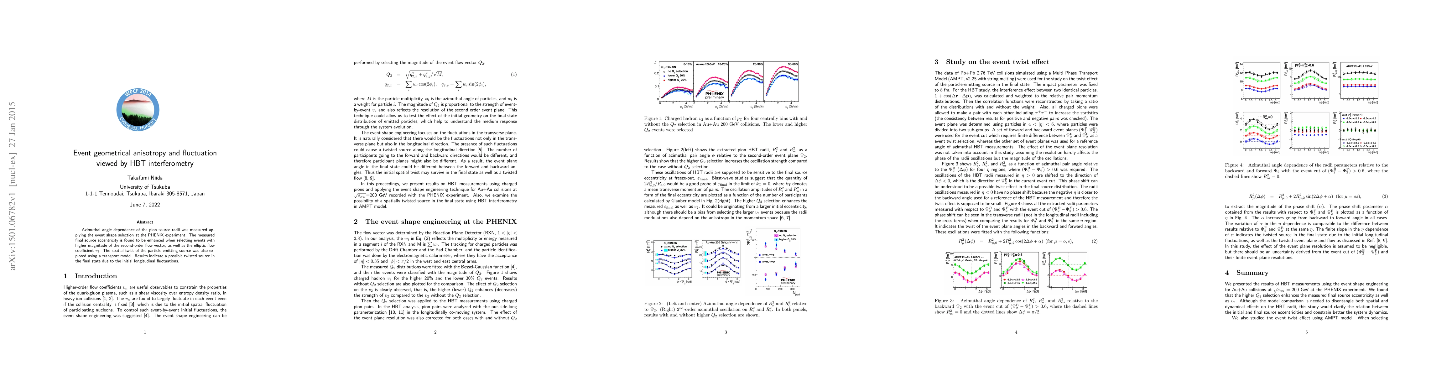 Azimuthal angle dependence of the pion source radii was measured applying the event shape selection at the PHENIX experiment. The measured final source eccentricity is found to be enhanced when selecting events with higher magnitude of the second-order flow vector, as well as the elliptic flow coefficient $v_{2}$. The spatial twist of the particle-emitting source was also explored using a transport model. Results indicate a possible twisted source in the final state due to the initial longitudinal fluctuations.