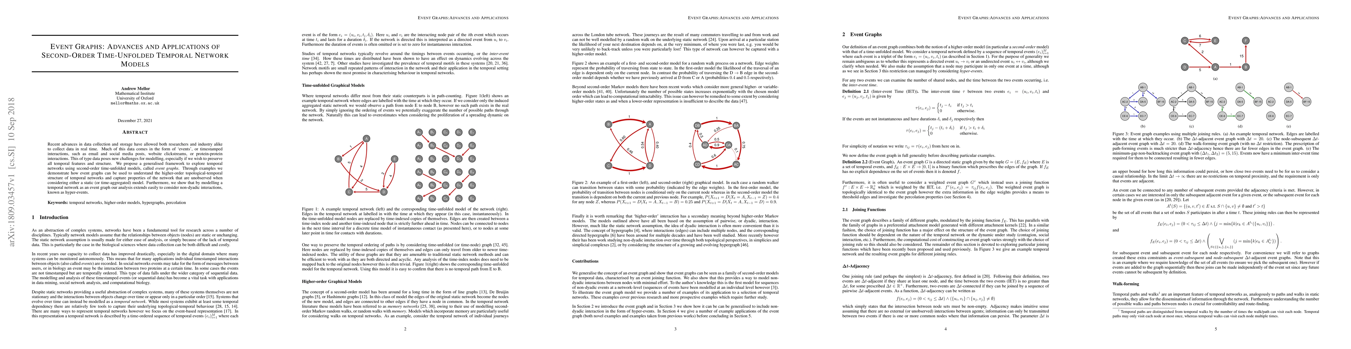 This paper proposes event graphs, a second-order time-unfolded model for temporal networks, to capture higher-order topological-temporal structures and non-dyadic interactions. It demonstrates the framework's ability to reveal properties unseen in static or aggregated models.
