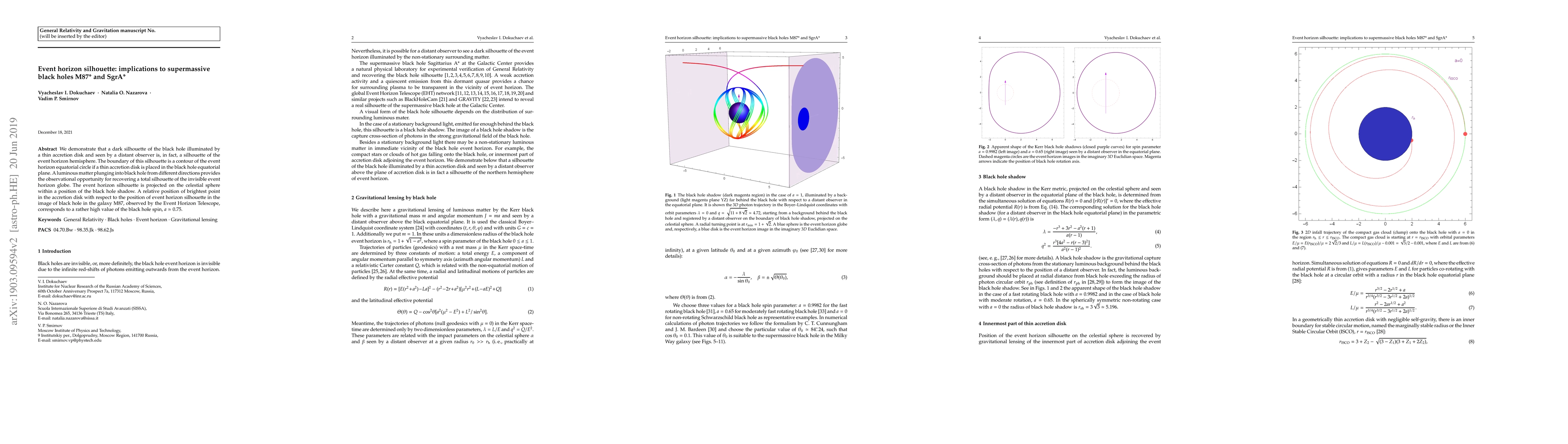 This paper demonstrates that the silhouette of a supermassive black hole, like those in M87* and SgrA*, observed by a distant viewer can reveal the event horizon's contour when illuminated by a thin accretion disk. The study suggests that the brightest point in the accretion disk relative to the event horizon silhouette indicates a high spin value for the black hole in M87, approximately $a\simeq0.75$.