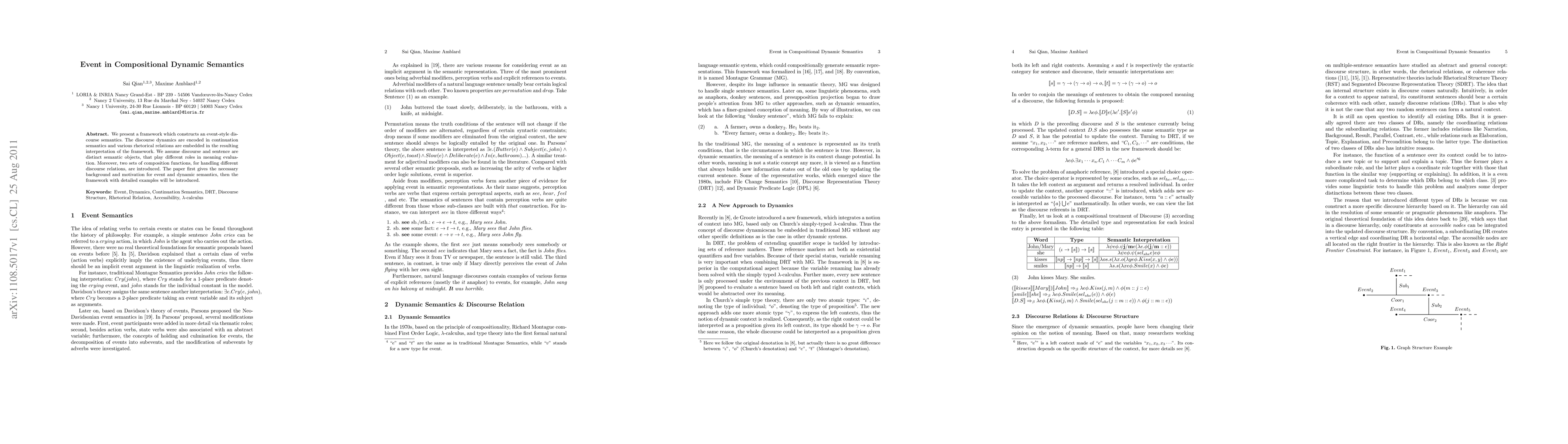 We present a framework which constructs an event-style dis- course semantics. The discourse dynamics are encoded in continuation semantics and various rhetorical relations are embedded in the resulting interpretation of the framework. We assume discourse and sentence are distinct semantic objects, that play different roles in meaning evalua- tion. Moreover, two sets of composition functions, for handling different discourse relations, are introduced. The paper first gives the necessary background and motivation for event and dynamic semantics, then the framework with detailed examples will be introduced.