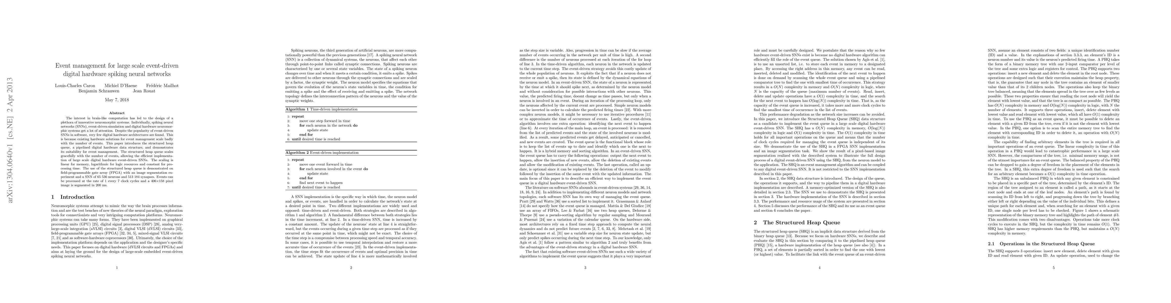 This paper introduces the structured heap queue, a pipelined digital hardware data structure for efficient event management in large scale event-driven spiking neural networks (SNNs). The proposed method scales linearly with memory, logarithmically with logic resources, and maintains constant processing time, demonstrated through FPGA implementation with an image segmentation experiment.