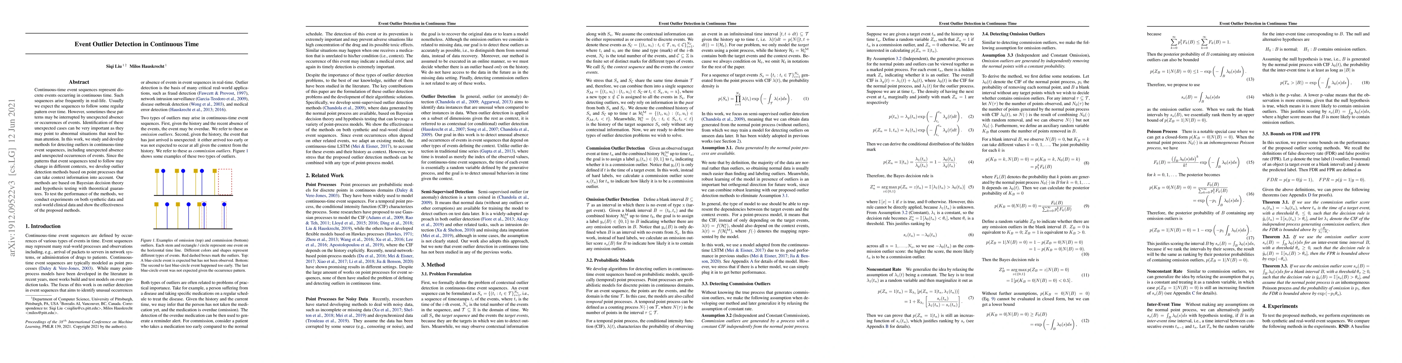 This paper develops methods for detecting outliers in continuous-time event sequences using point processes and Bayesian decision theory. The proposed methods identify unexpected absences and occurrences of events, tested on synthetic and real-world clinical data, demonstrating their effectiveness.