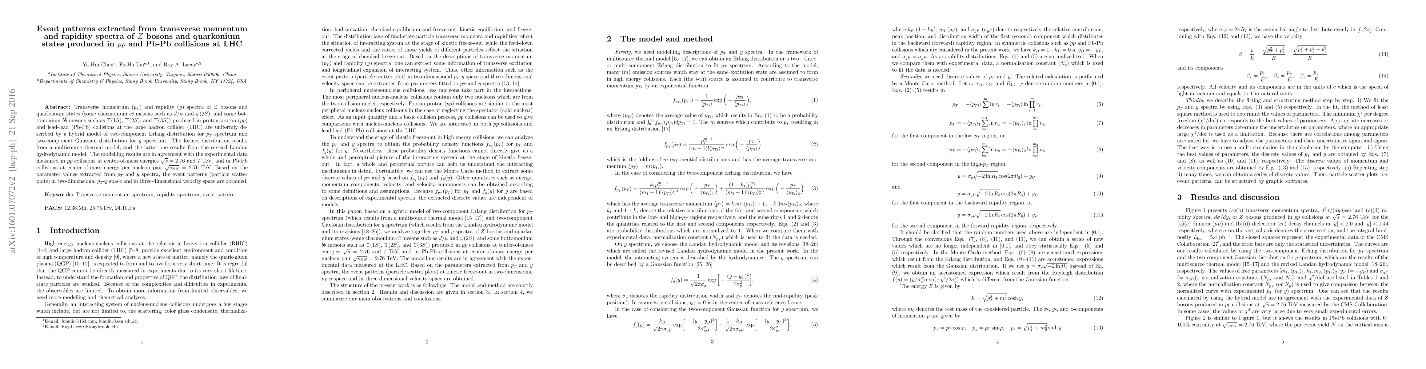 Transverse momentum ($p_T$) and rapidity ($y$) spectra of $Z$ bosons and quarkonium states (some charmonium $c\bar c$ mesons such as $J/\psi$ and $\psi(2S)$, and some bottomonium $b\bar b$ mesons such as $\Upsilon(1S)$, $\Upsilon(2S)$, and $\Upsilon(3S)$) produced in proton-proton ($pp$) and lead-lead (Pb-Pb) collisions at the large hadron collider (LHC) are uniformly described by a hybrid model of two-component Erlang distribution for $p_T$ spectrum and two-component Gaussian distribution for $y$ spectrum. The former distribution results from a multisource thermal model, and the latter one results from the revised Landau hydrodynamic model. The modelling results are in agreement with the experimental data measured in $pp$ collisions at center-of-mass energies $\sqrt{s}=2.76$ and 7 TeV, and in Pb-Pb collisions at center-of-mass energy per nucleon pair $\sqrt{s_{NN}}=2.76$ TeV. Based on the parameter values extracted from $p_T$ and $y$ spectra, the event patterns (particle scatter plots) in two-dimensional $p_T$-$y$ space and in three-dimensional velocity space are obtained.