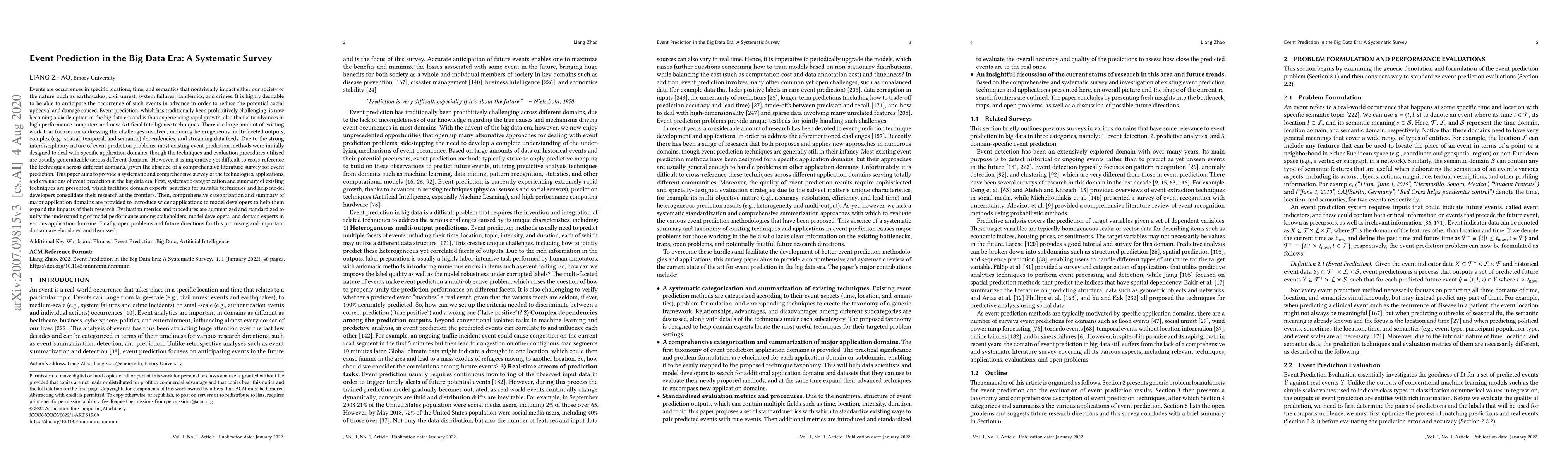 This paper provides a systematic survey of event prediction technologies in the big data era, categorizing existing techniques and applications, and standardizing evaluation metrics to unify understanding across various domains. It also highlights open problems and future research directions.