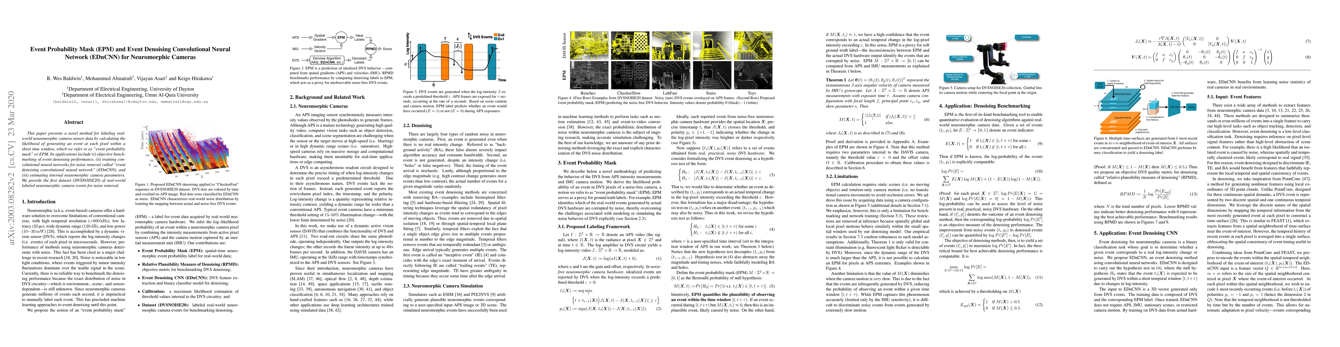 This paper introduces the Event Probability Mask (EPM) and Event Denoising Convolutional Neural Network (EDnCNN) for processing neuromorphic camera data, offering a method to label event likelihoods and a dataset for benchmarking denoising performance. The EDnCNN is trained to improve noise removal in neuromorphic camera events.