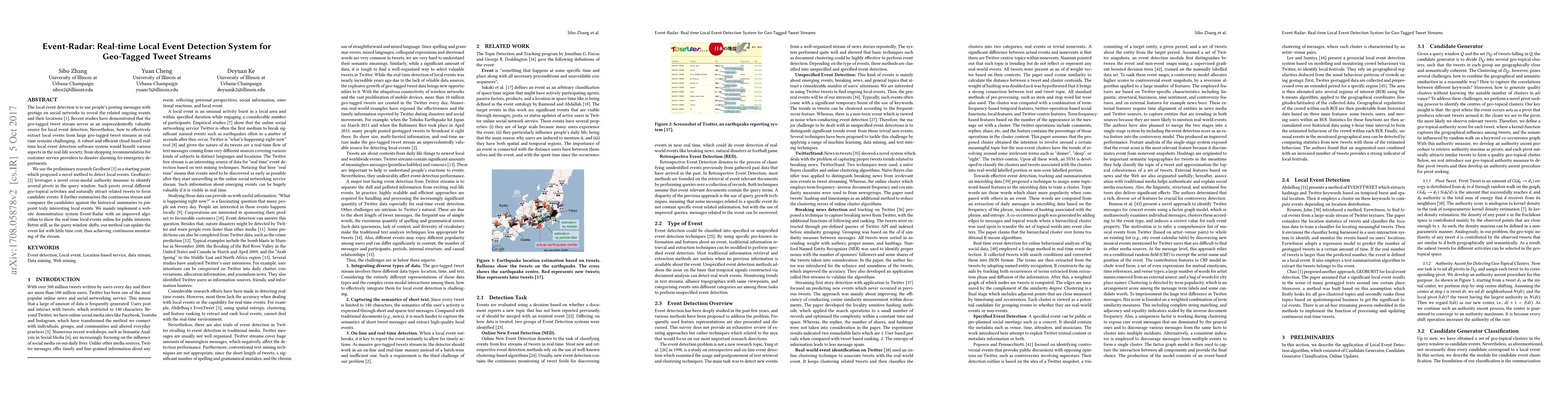 Event-Radar is a cloud-based real-time local event detection system that leverages geo-tagged tweets to identify and display ongoing local events. It enhances GeoBurst with a cross-modal authority measure to pinpoint pivotal moments, continuously monitoring and updating event lists with minimal time cost.