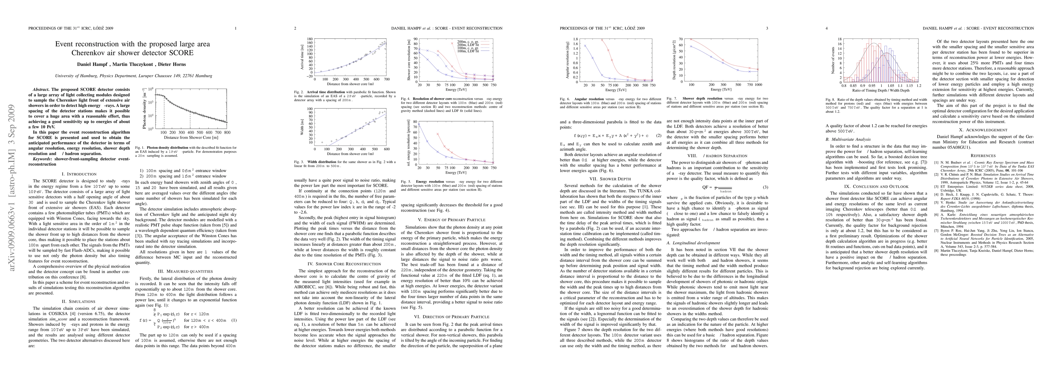 The SCORE detector aims to detect high-energy gamma-rays by sampling Cherenkov light from extensive air showers with a large array of light modules. The paper presents an event reconstruction algorithm to evaluate the detector's performance, focusing on angular, energy, and shower depth resolutions, as well as gamma/hadron separation capabilities.