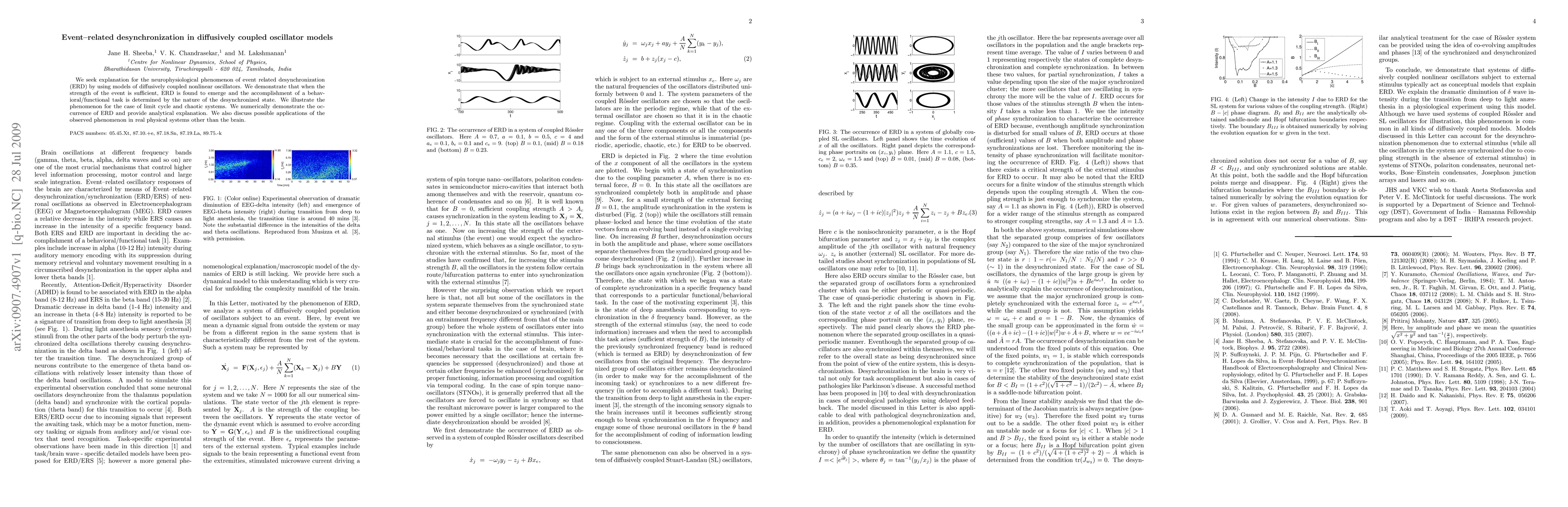 This paper explores the neurophysiological phenomenon of event-related desynchronization (ERD) using models of diffusively coupled nonlinear oscillators, demonstrating its emergence under sufficient event strength and its role in task accomplishment. The study provides both numerical and analytical explanations for ERD in limit cycle and chaotic systems, and discusses its potential applications beyond the brain.