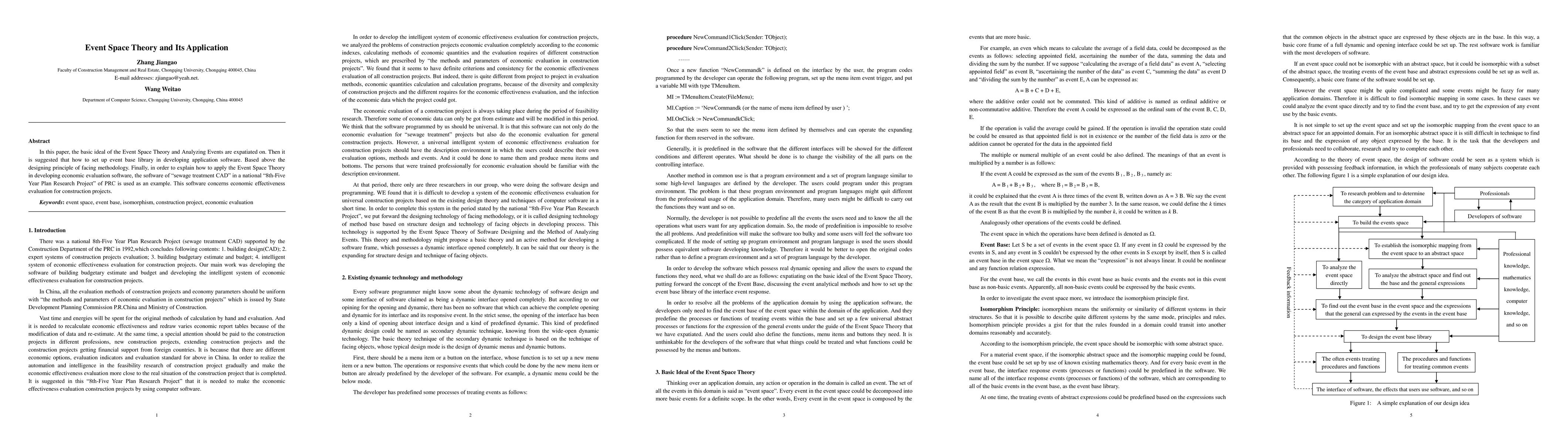 In this paper, the basic ideal of the Event Space Theory and Analyzing Events are expatiated on. Then it is suggested that how to set up event base library in developing application software. Based above the designing principle of facing methodology. Finally, in order to explain how to apply the Event Space Theory in developing economic evaluation software, the software of "sewage treatment CAD" in a national "8th-Five Year Plan Research Project" of PRC is used as an example. This software concerns economic effectiveness evaluation for construction projects.