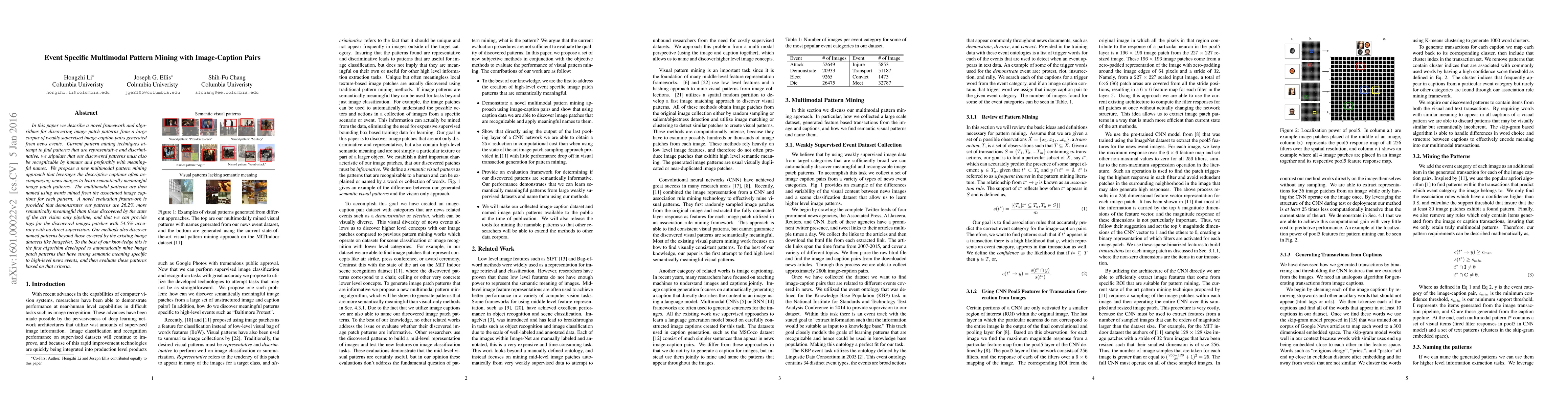This paper introduces a novel framework for discovering semantically meaningful image patch patterns from weakly supervised image-caption pairs related to news events. The proposed multimodal pattern mining approach leverages descriptive captions to name patterns, achieving 26.2% higher semantic meaning and 54.5% accuracy in tagging compared to existing vision-only methods.