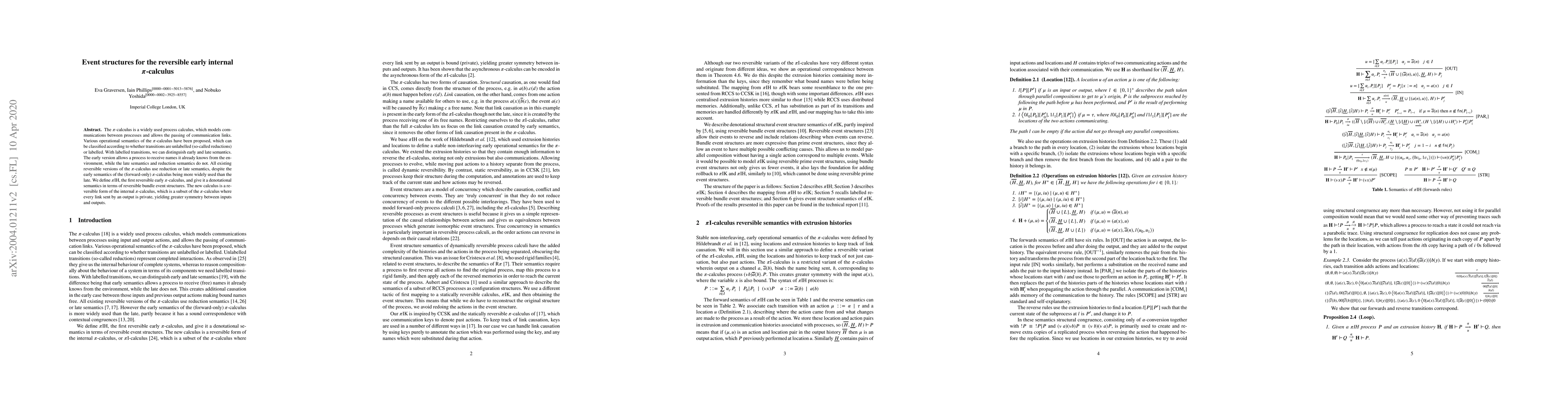 This paper introduces piIH, the first reversible version of the early internal pi-calculus, providing it with a denotational semantics based on reversible bundle event structures. It aims to achieve greater symmetry between inputs and outputs by restricting link usage to private communications.