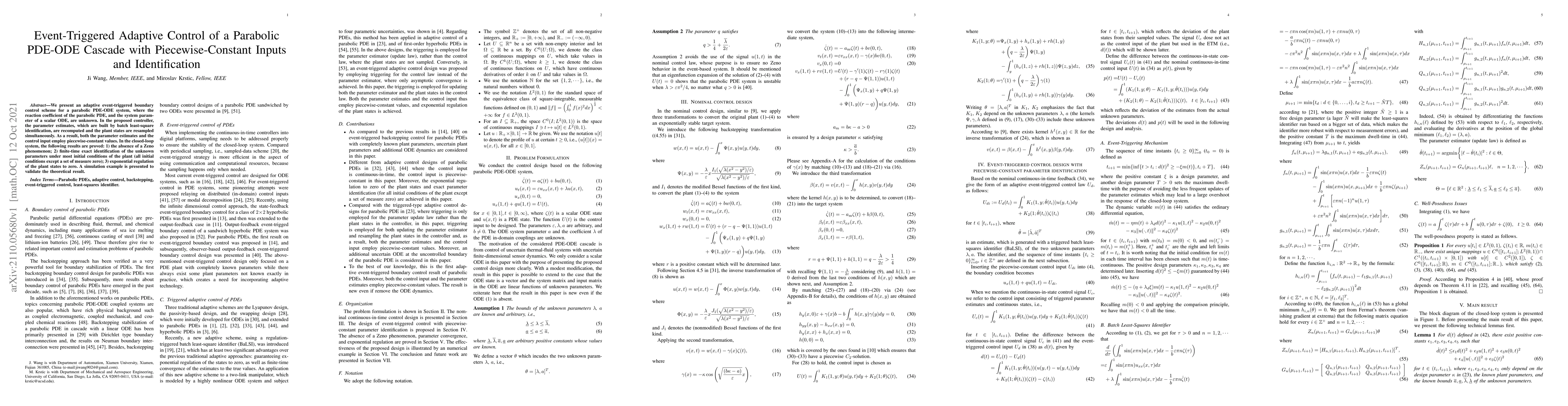 This paper proposes an adaptive event-triggered control scheme for a parabolic PDE-ODE system with unknown parameters, employing piecewise-constant inputs and batch least-square identification. The controller ensures no Zeno behavior, finite-time exact parameter identification, and exponential state regulation to zero, validated by simulation.