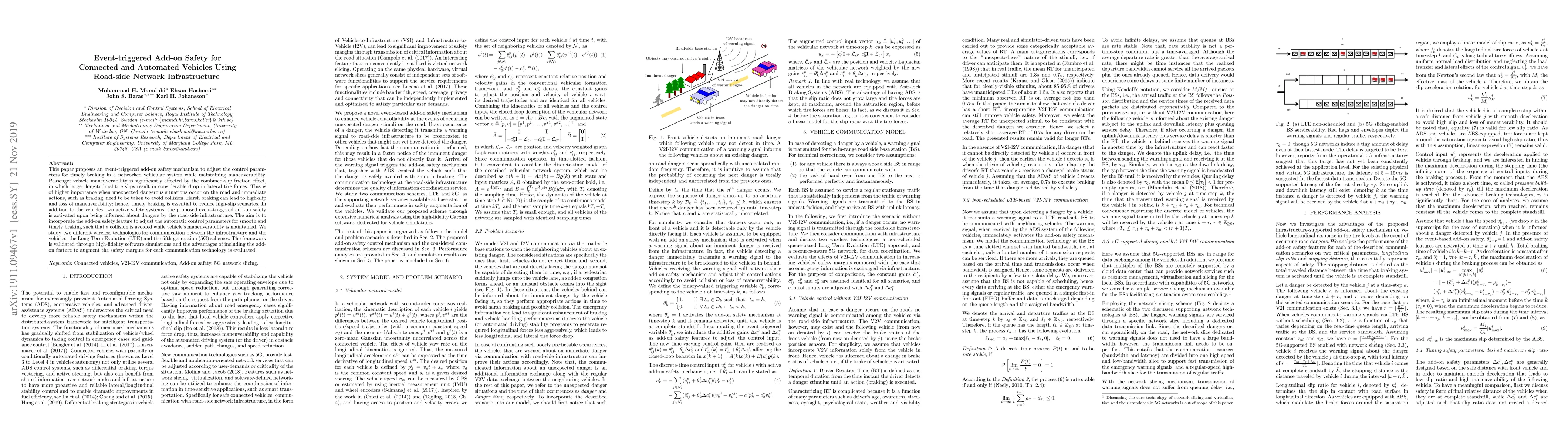 This paper proposes an event-triggered add-on safety mechanism to adjust the control parameters for timely braking in a networked vehicular system while maintaining maneuverability. Passenger vehicle maneuverability is significantly affected by the combined-slip friction effect, in which larger longitudinal tire slips result in considerable drop in lateral tire forces. This is of higher importance when unexpected dangerous situations occur on the road and immediate actions, such as braking, need to be taken to avoid collision. Harsh braking can lead to high-slip and loss of maneuverability, hence, timely braking is essential to reduce high-slip scenarios. In addition to the vehicles own active safety systems, the proposed event-triggered add-on safety is activated upon being informed about dangers by the road-side infrastructure. The aim is to incorporate the add-on safety feature to adjust the automatic control parameters for smooth and timely braking such that a collision is avoided while vehicle's maneuverability is maintained. We study two different wireless technologies for communication between the infrastructure and the vehicles, the Long-Term Evolution (LTE) and the fifth generation (5G) schemes. The framework is validated through high-fidelity software simulations and the advantages of including the add-on feature to augment the safety margins for each communication technology is evaluated.