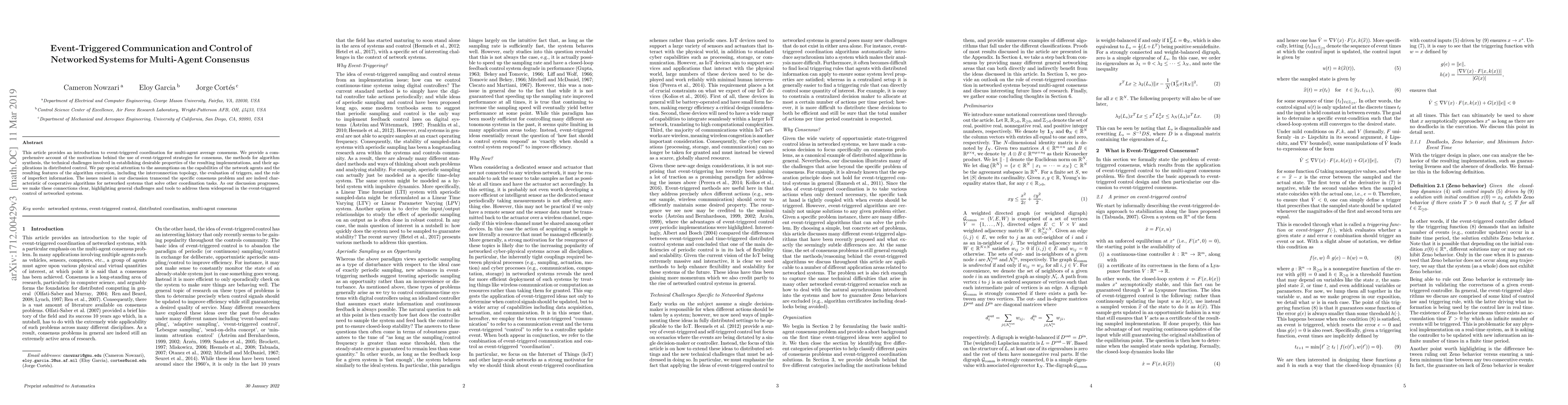 This paper introduces event-triggered coordination strategies for achieving multi-agent average consensus, addressing algorithm synthesis, challenges in implementation, and implications for distributed control. It highlights broader issues in networked systems control and emphasizes the significance of network agent capabilities and imperfect information.