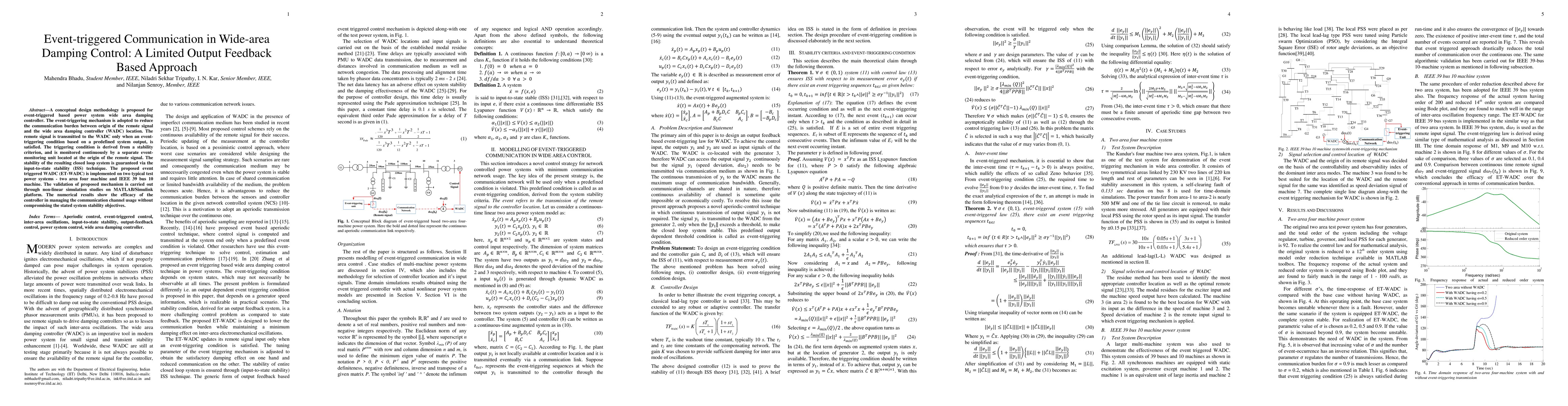 A conceptual design methodology is proposed for event-triggered based power system wide area damping controller. The event-triggering mechanism is adopted to reduce the communication burden between origin of the remote signal and the wide area damping controller (WADC) location. The remote signal is transmitted to the WADC only when an event-triggering condition based on a predefined system output, is satisfied. The triggering condition is derived from a stability criterion, and is monitored continuously by a separate event-monitoring unit located at the origin of the remote signal. The stability of the resulting closed loop system is guaranteed via the input-to-state stability (ISS) technique. The proposed event triggered WADC (ET-WADC) is implemented on two typical test power systems - two area four machine and IEEE 39 bus 10 machine. The validation of proposed mechanism is carried out through non-linear simulation studies on MATLAB/Simulink platform. The numerical results show the efficacy of the controller in managing the communication channel usage without compromising the stated system stability objectives.